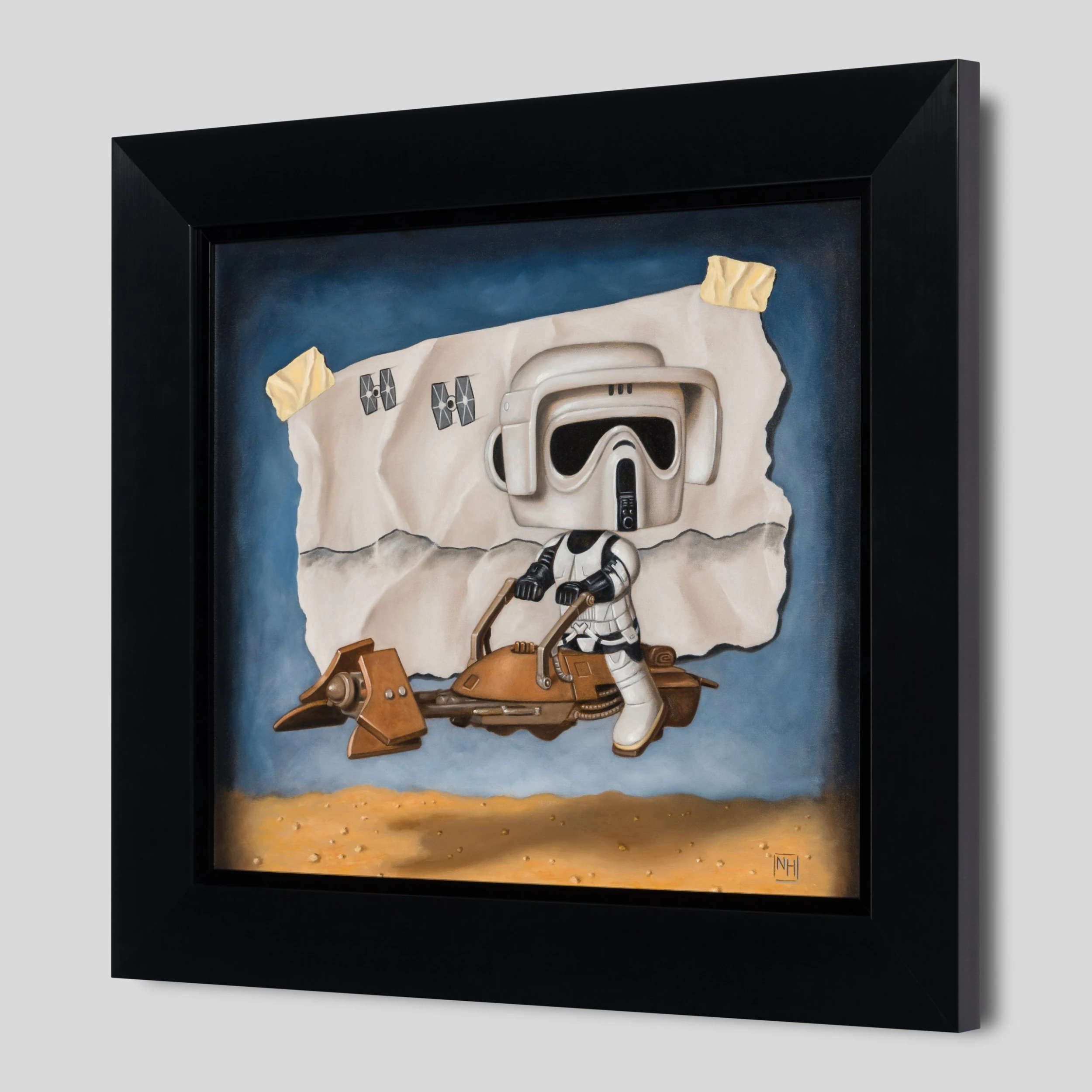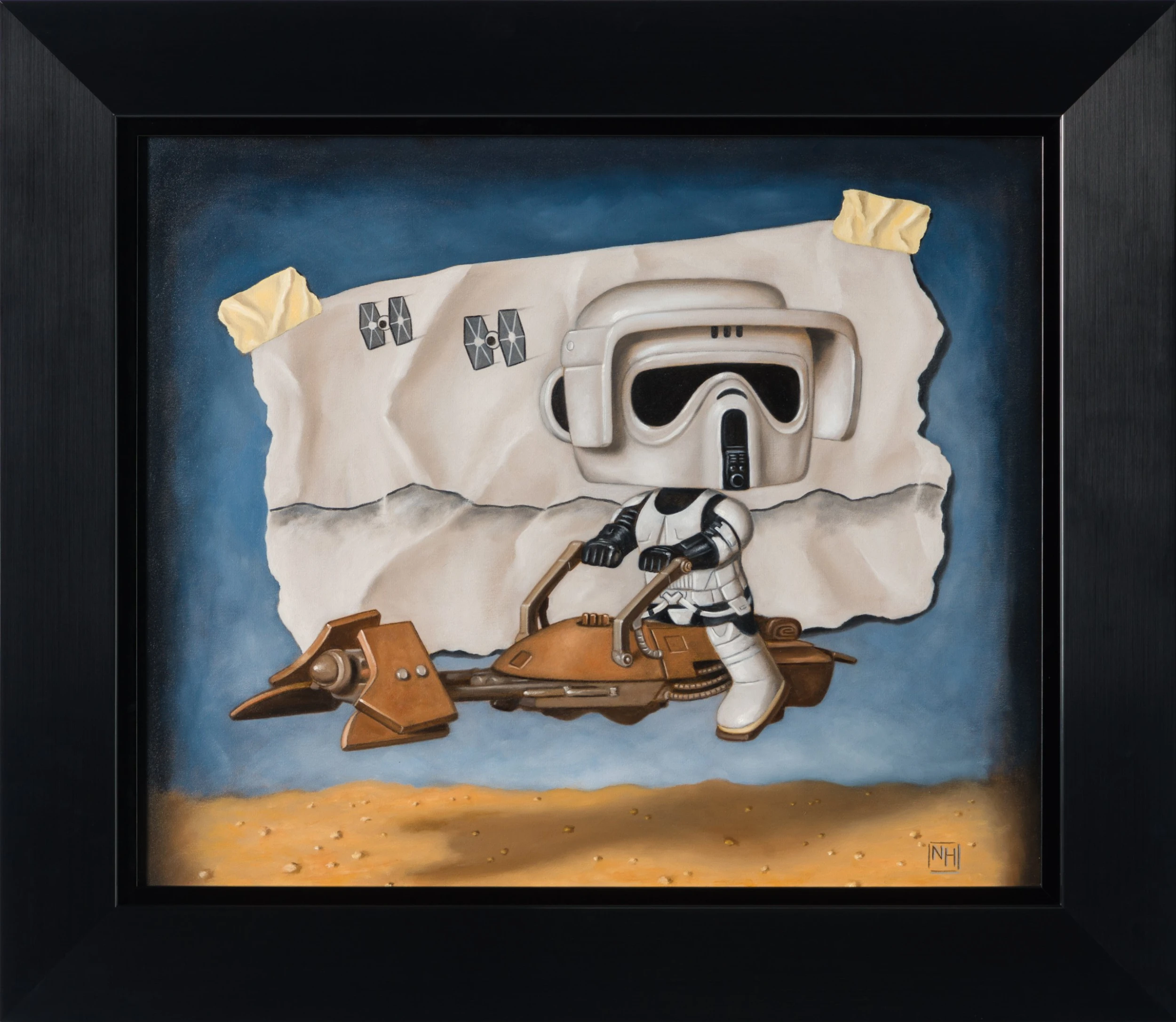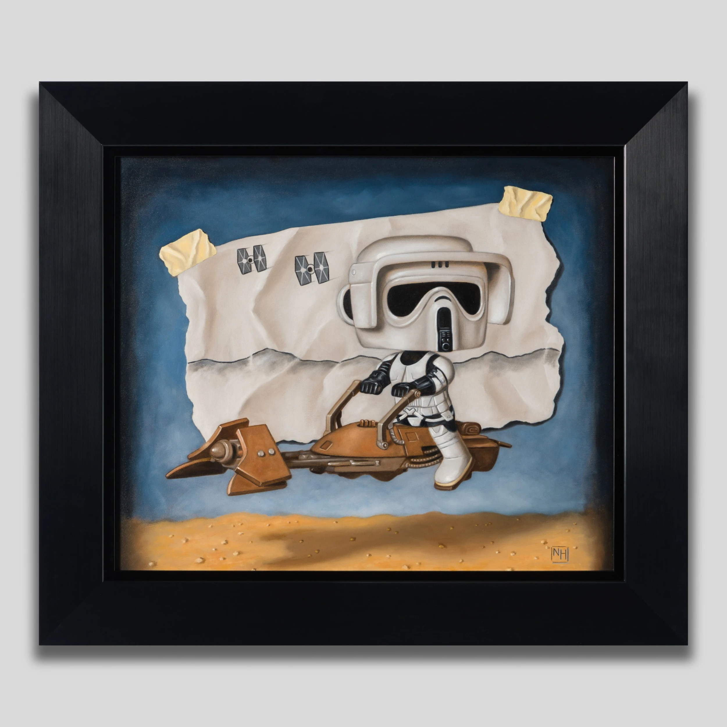 In this feisty original oil on board by Nigel Humphries, we see one of the world’s most iconic bad guys rendered in an extra-ordinarily adorable way. You can almost hear the Stormtroopers race through the forests of Endor atop their speeder bikes depicted here against a dual toned background that accentuates the monochromatic colour of their armour.