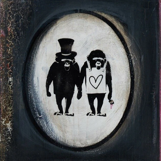 James McQueen’s complex application of paint elevates his art beyond the mere imitation of a nostalgic object towards an art that is rich and expressive, exploring themes of Pop art and abstraction. Working under a pseudonym, he introduces an autobiographical dimension to the work with his trademark monkey, using this mischievous character as a kind of personal insignia.