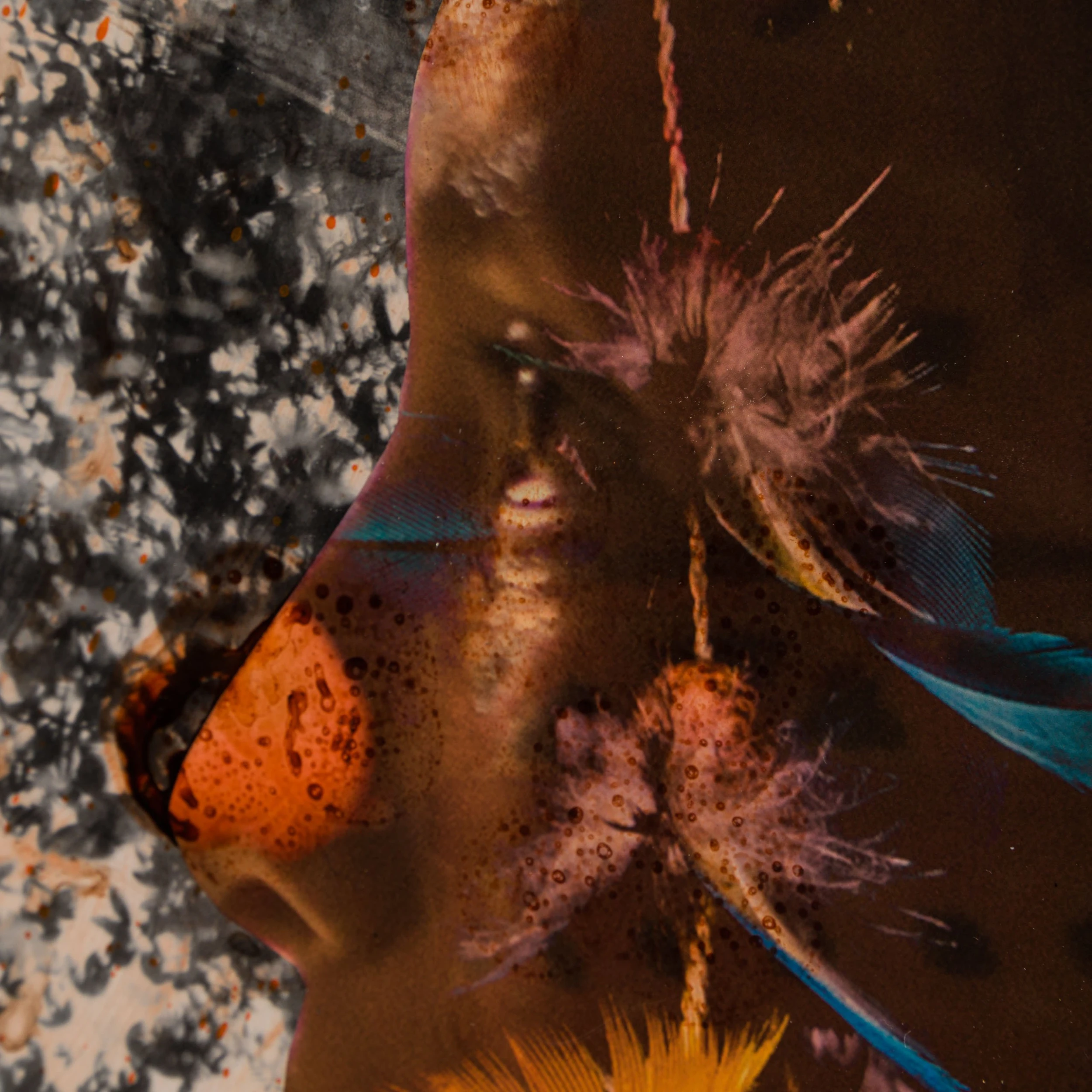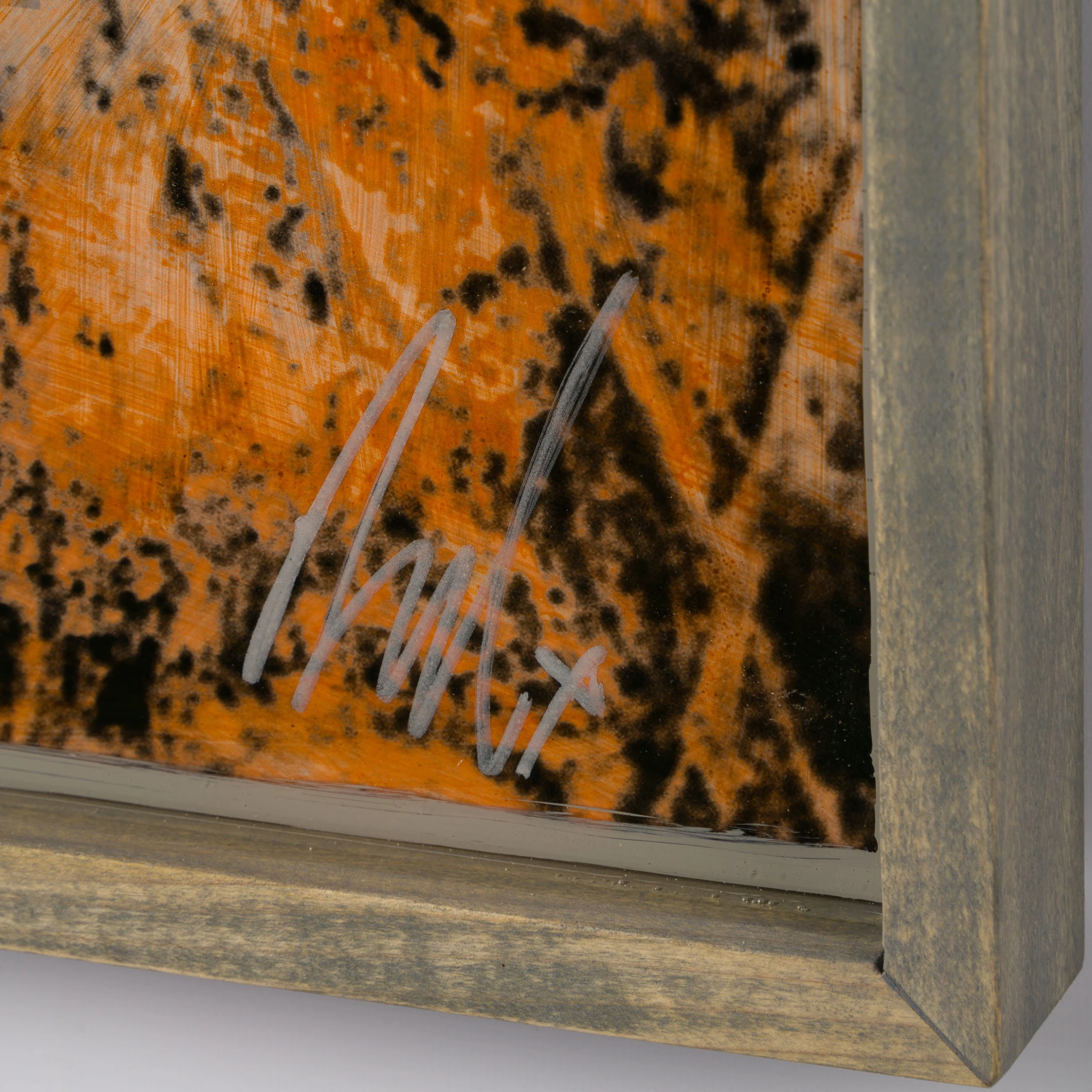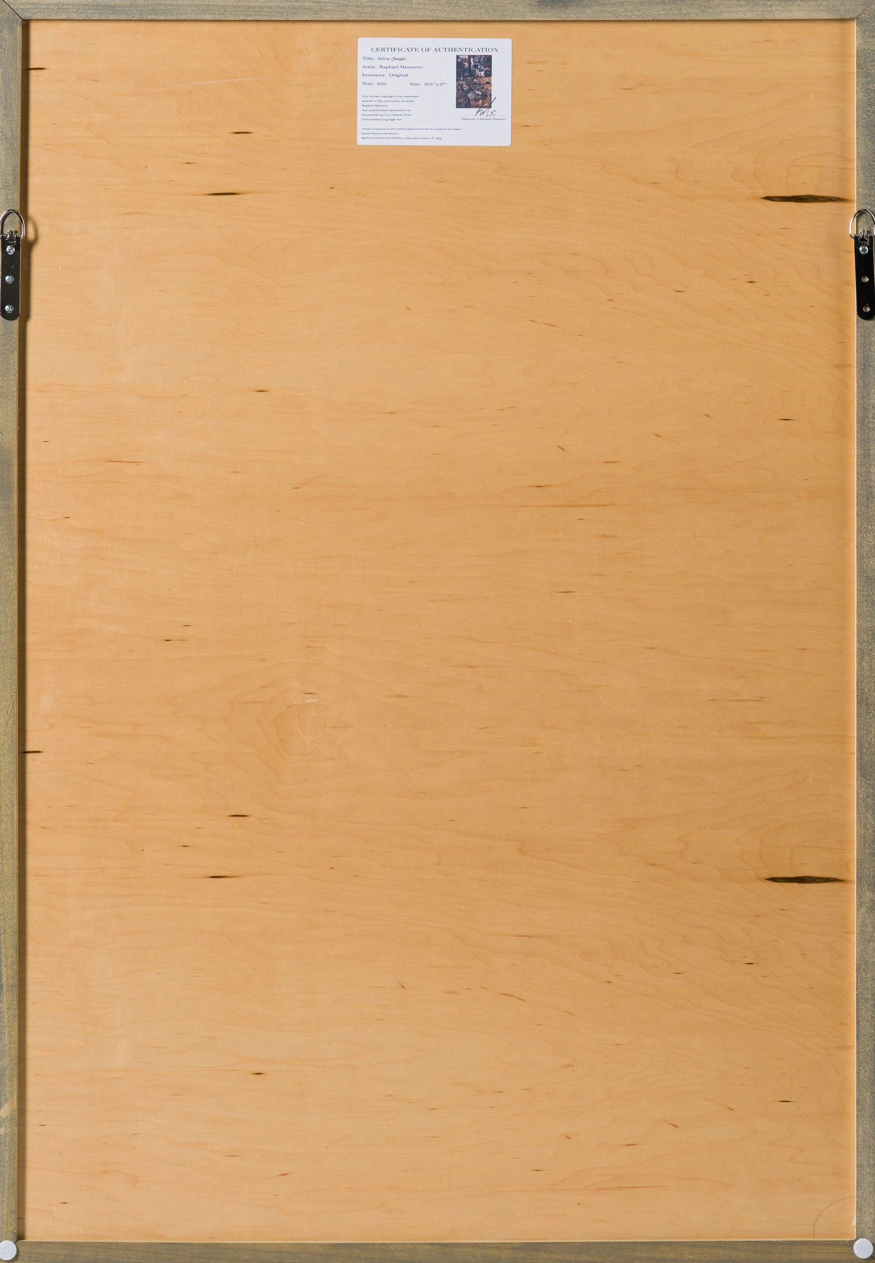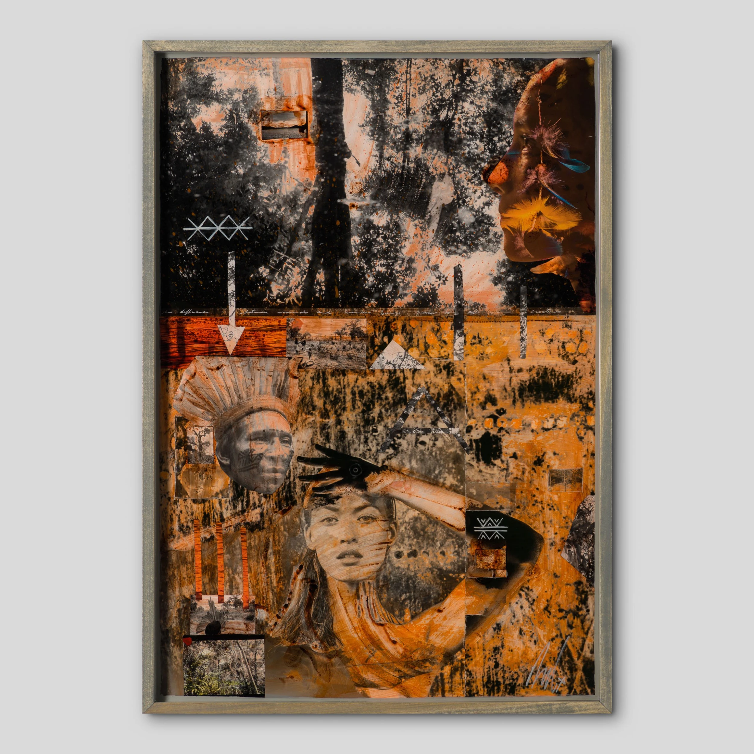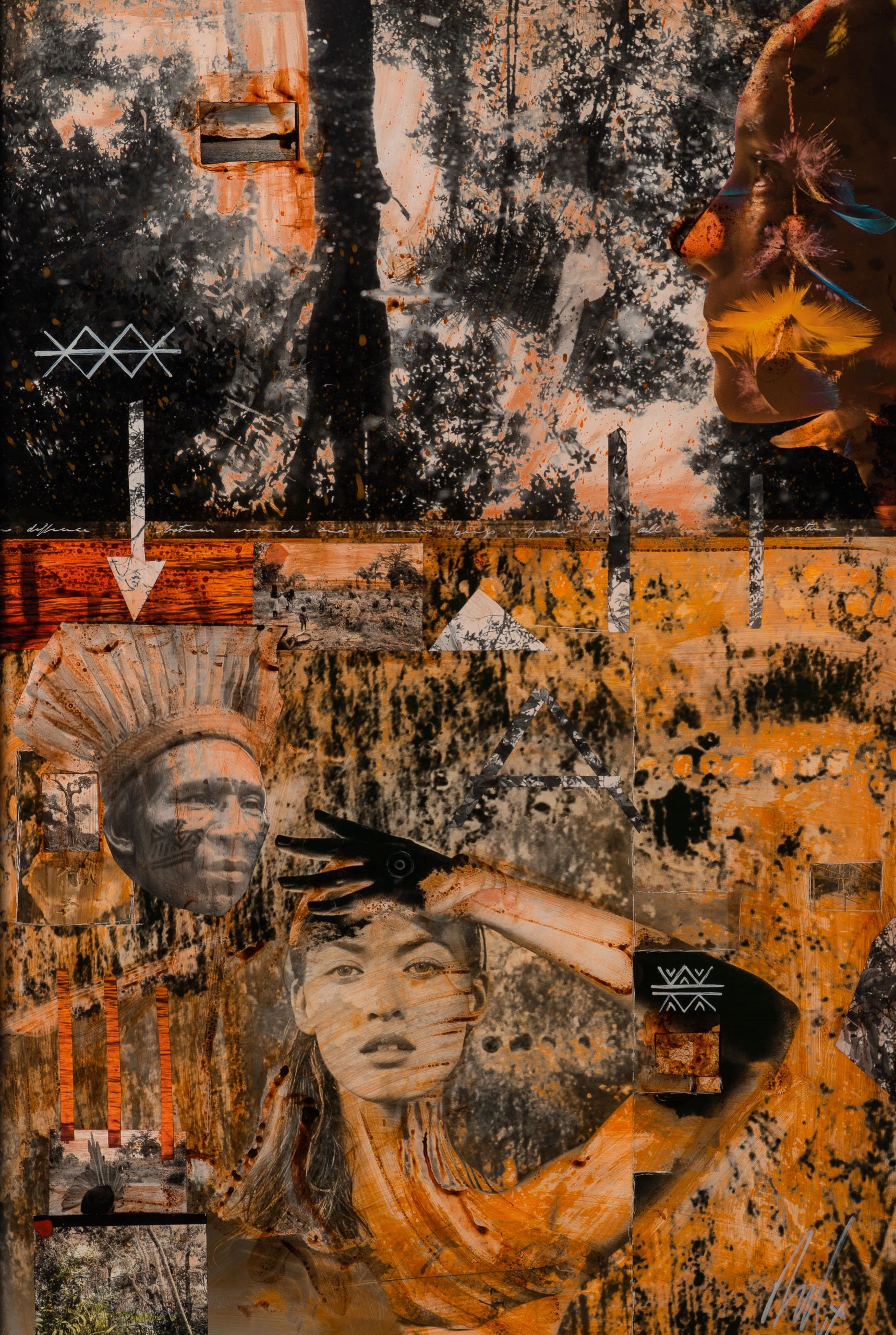With Moroccan pigments and Vietnamese paints, Mazzucco’s pieces are characterised by the juxtaposition between wildlife and cultural photography, this incredible piece forms part of his introspective collection Grass Roots 2023. “Selva (Jungle)” features beautiful photography in sepia earthy tones, enhancing the raw beauty of the images. The piece tells a story in layers. The overlaying of photography, paint, handwriting, and resin adds life into the composition, creating a statement original. The pops of colour added sporadically throughout the composition create the spontaneous dynamic that this wildlife piece represents.