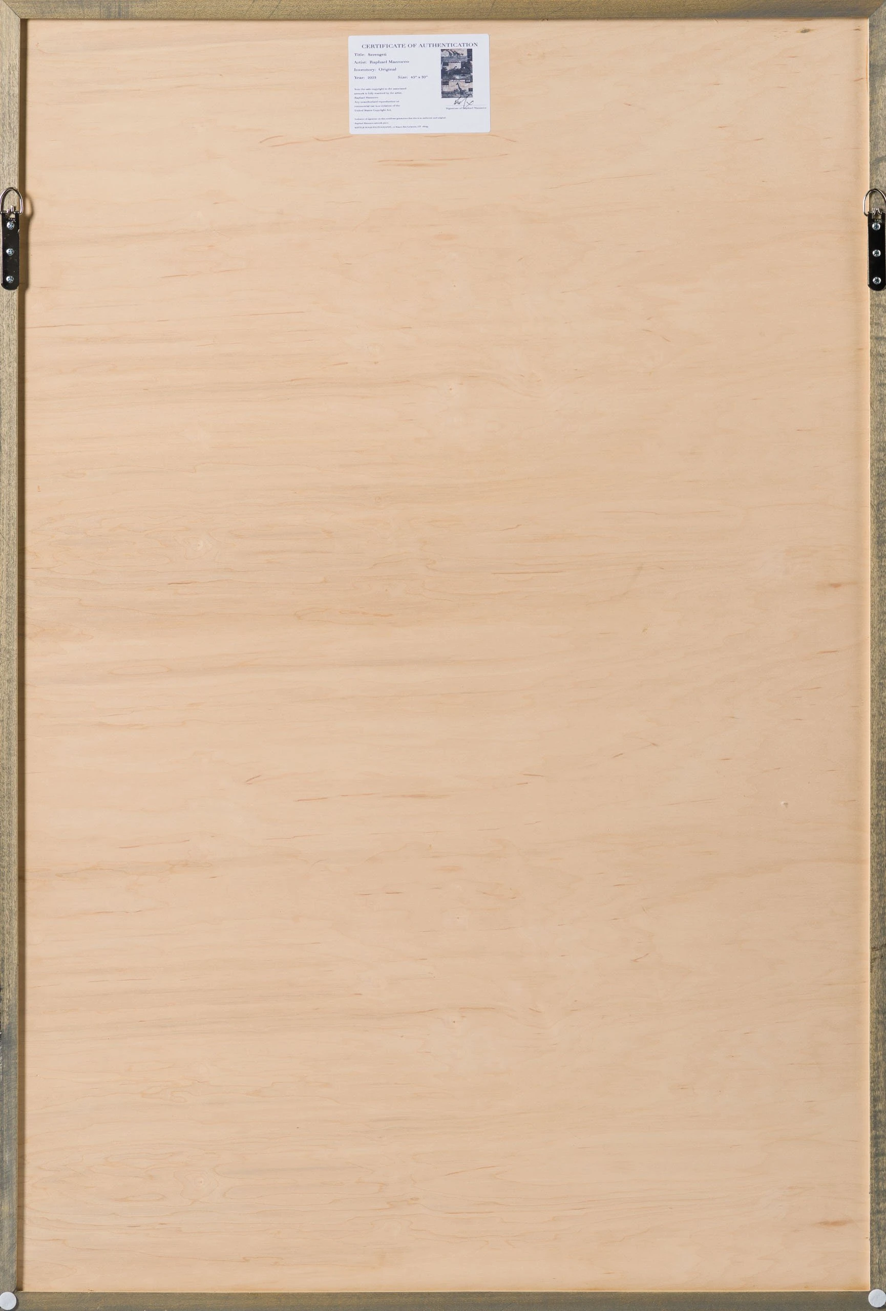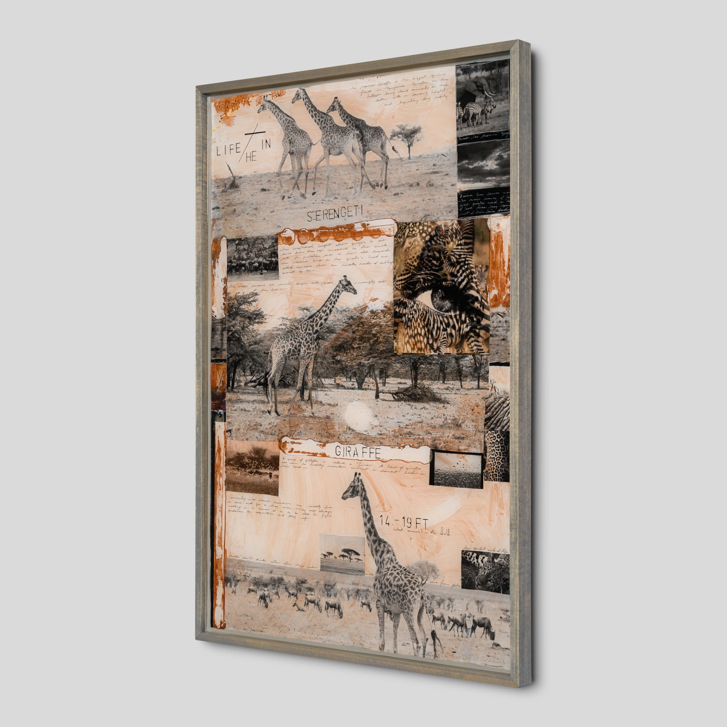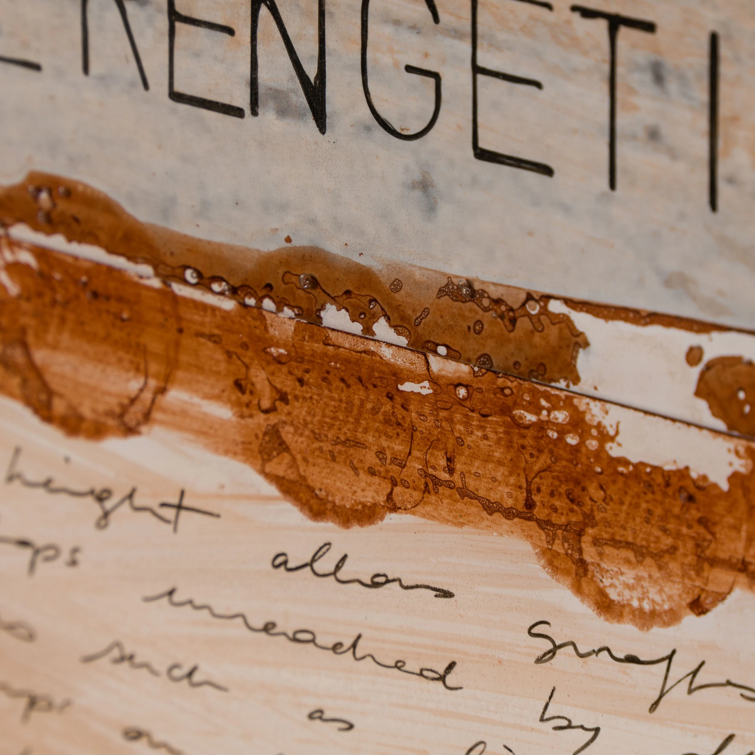 With Moroccan pigments and Vietnamese paints, Mazzucco’s pieces are characterised by the juxtaposition between wildlife and cultural photography, this incredible piece forms part of his introspective collection Grass Roots 2023. “Serengeti” features photography, mainly in sepia earthy tones, enhancing the raw beauty of the images. The piece tells a story in layers. The overlaying of photography, paint, handwriting, and resin adds life into the composition, creating a statement original. The use of different images sizes create the intrinsic depth, characteristic of Mazzucco’s originals.