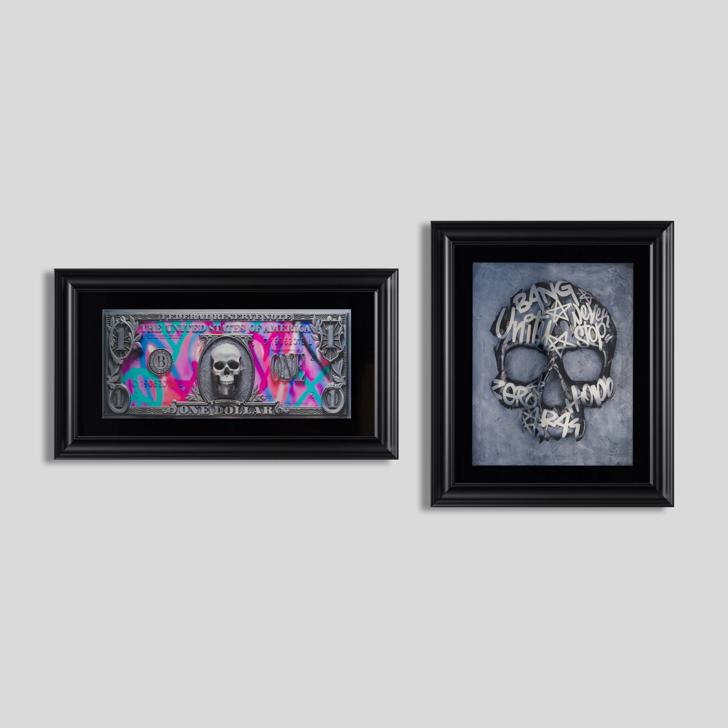A set of two limited edition flatbed giclée artworks on glass by Dan Lane bespoke framed in black painted pine.