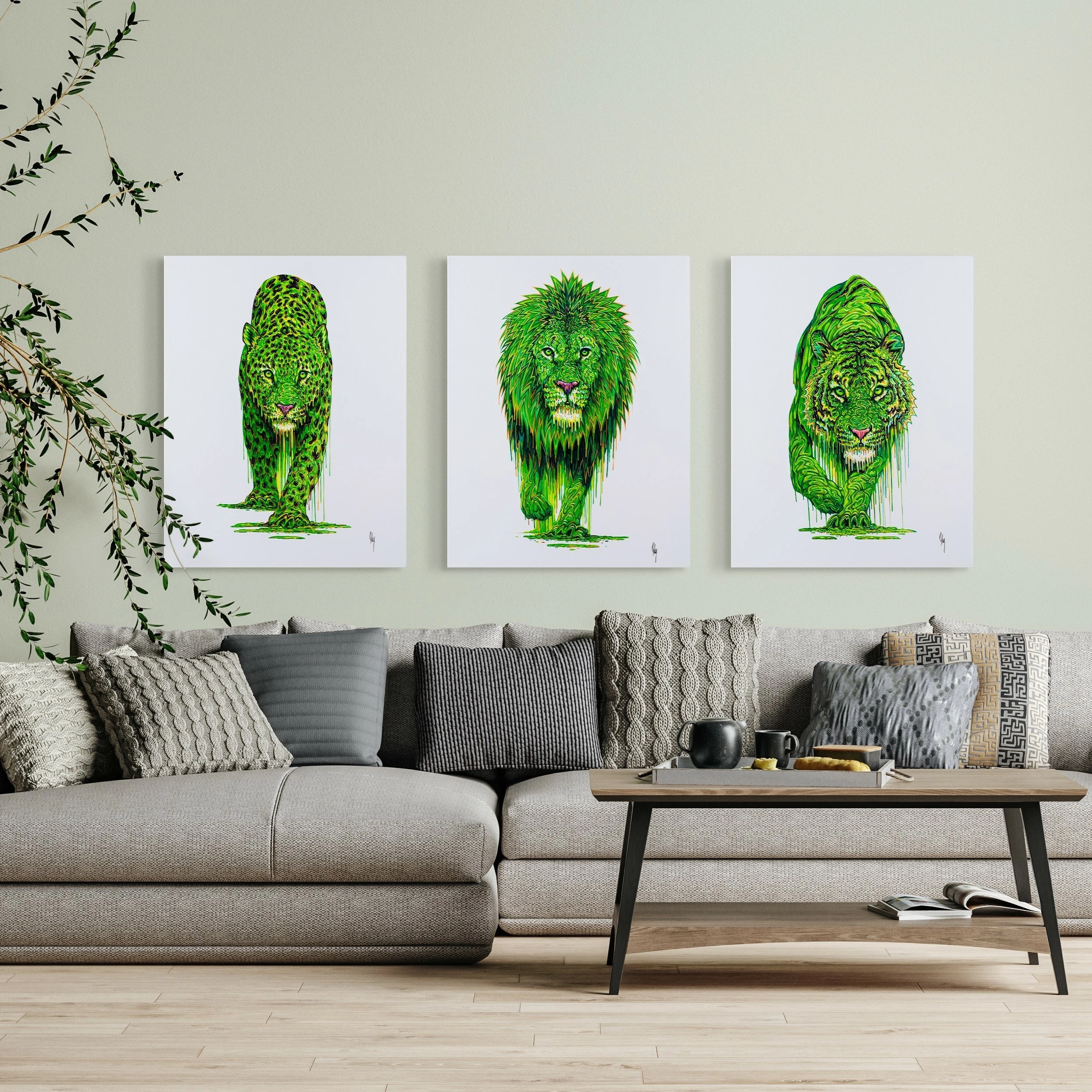 Named with different shades of green, this set of boutique editions features a Lion, Tiger, and a Leopard, all painted in Robert’s signature style. Many of Oxley’s pieces skilfully blend elements of surrealism and expressionism, infusing each piece with energy and emotion. His expressive brushwork is energetic and fluid, giving his paintings a sense of movement and spontaneity as his captivating portraits feature wild animals created through intense patterns and psychedelic colour. This loose style adds to the emotional impact of his artwork, giving life and movement to the animals in a stalking pose, while contrasting with the fixed stare of the eyes. His ability to capture the essence and character of the animals he paints in unmatched, creating an enchanting visual experience that celebrates the beauty, power, and mystique of the animals we share the planet with.