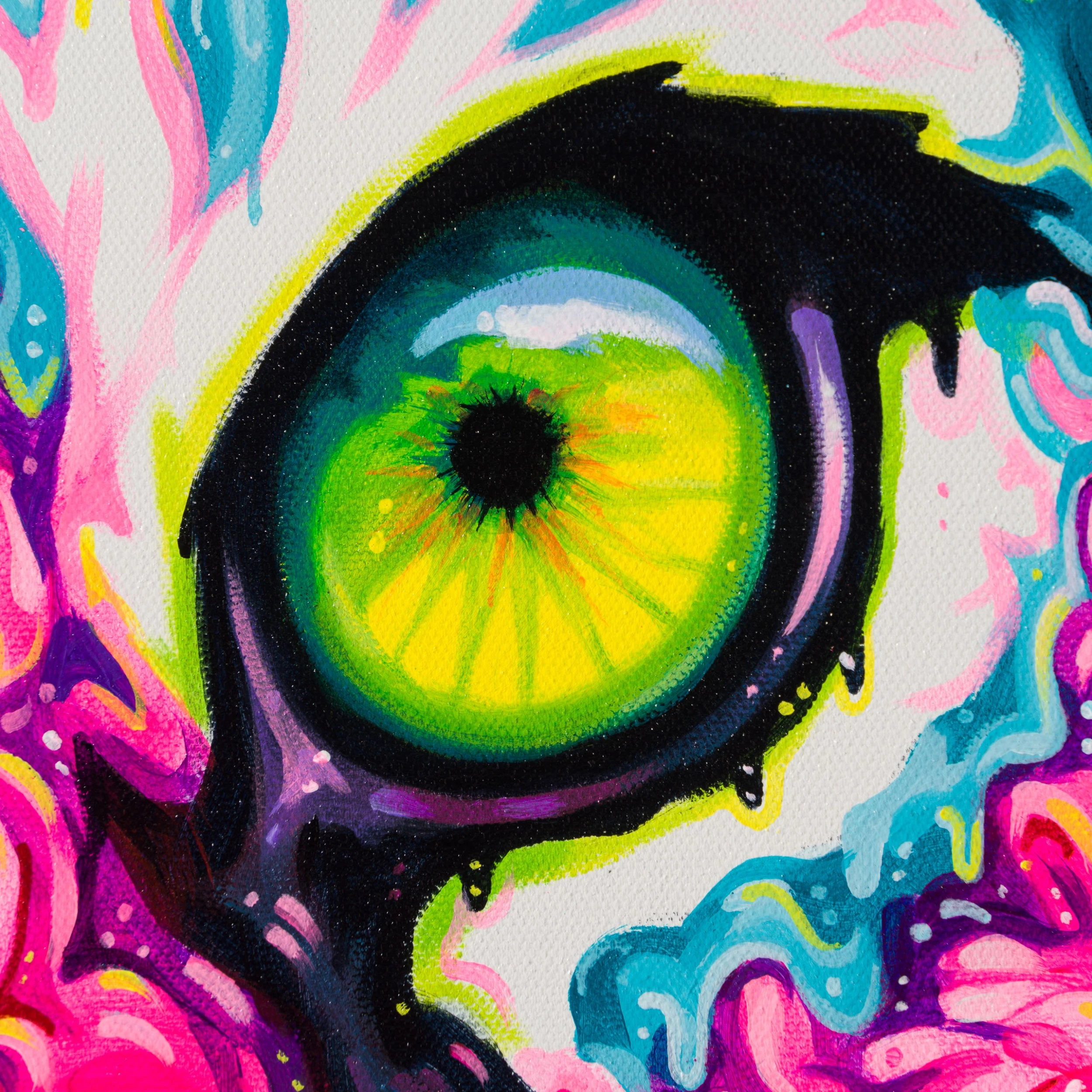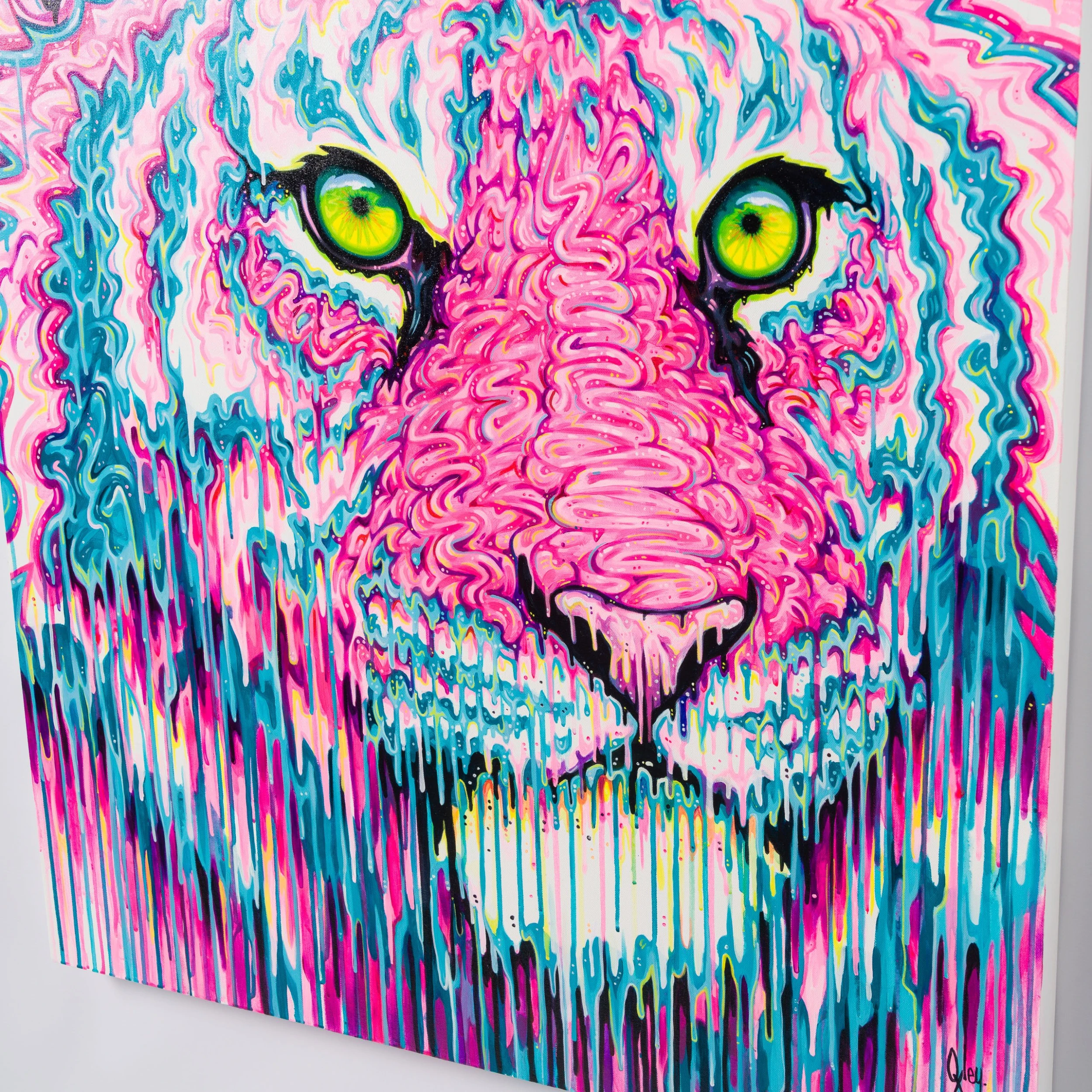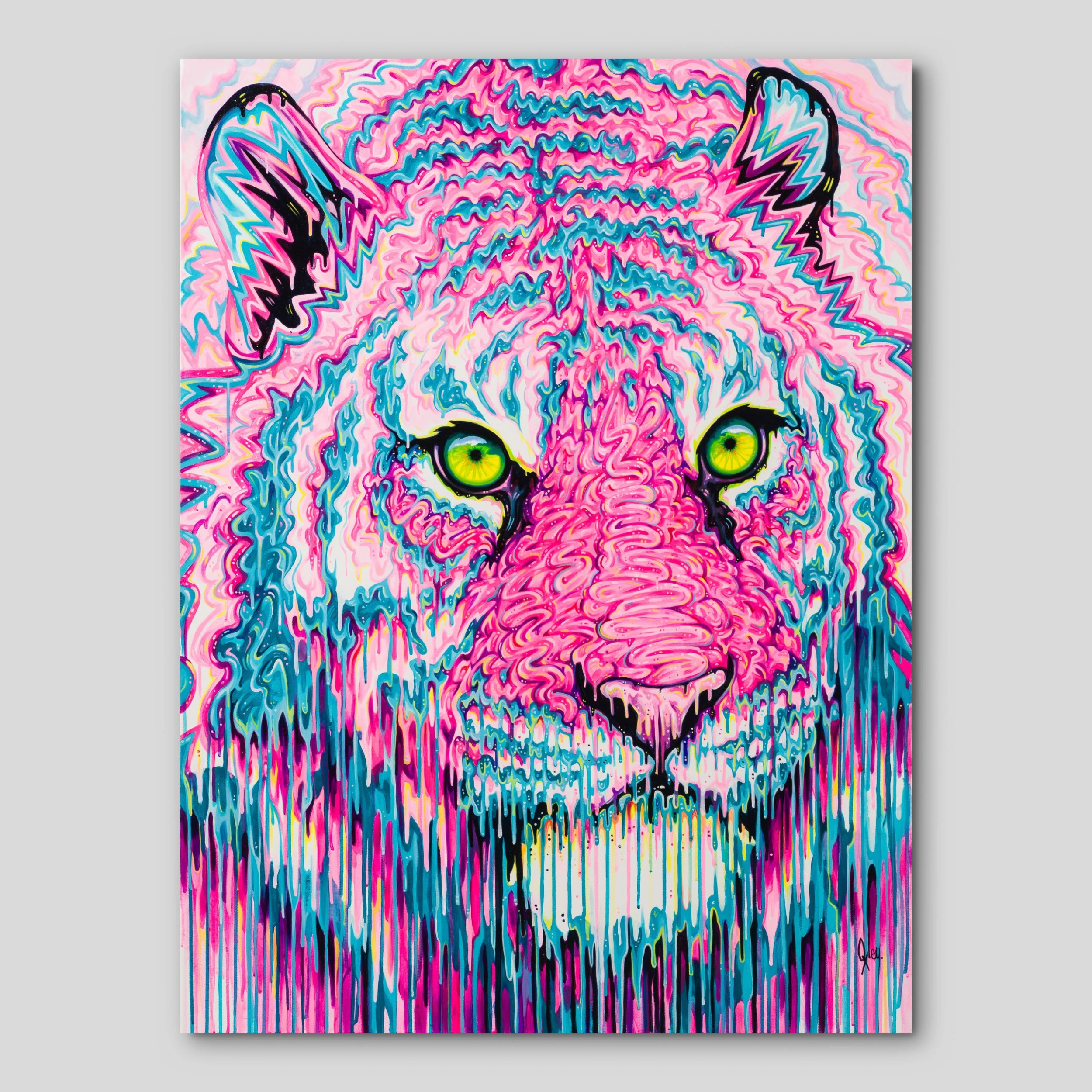 Many of Oxley’s pieces skilfully blend elements of surrealism and expressionism, infusing each piece with energy and emotion. His expressive brushwork is energetic and fluid, giving his paintings a sense of movement and spontaneity as his captivating portraits feature wild animals created through intense patterns and psychedelic colour. The traditional colours of the animal are overthrown by exciting vibrant shades, transforming it into an “ethereal, astral” being through his kaleidoscopic use of colour and form. The strong rainbow shades contrast beautifully with the white background.