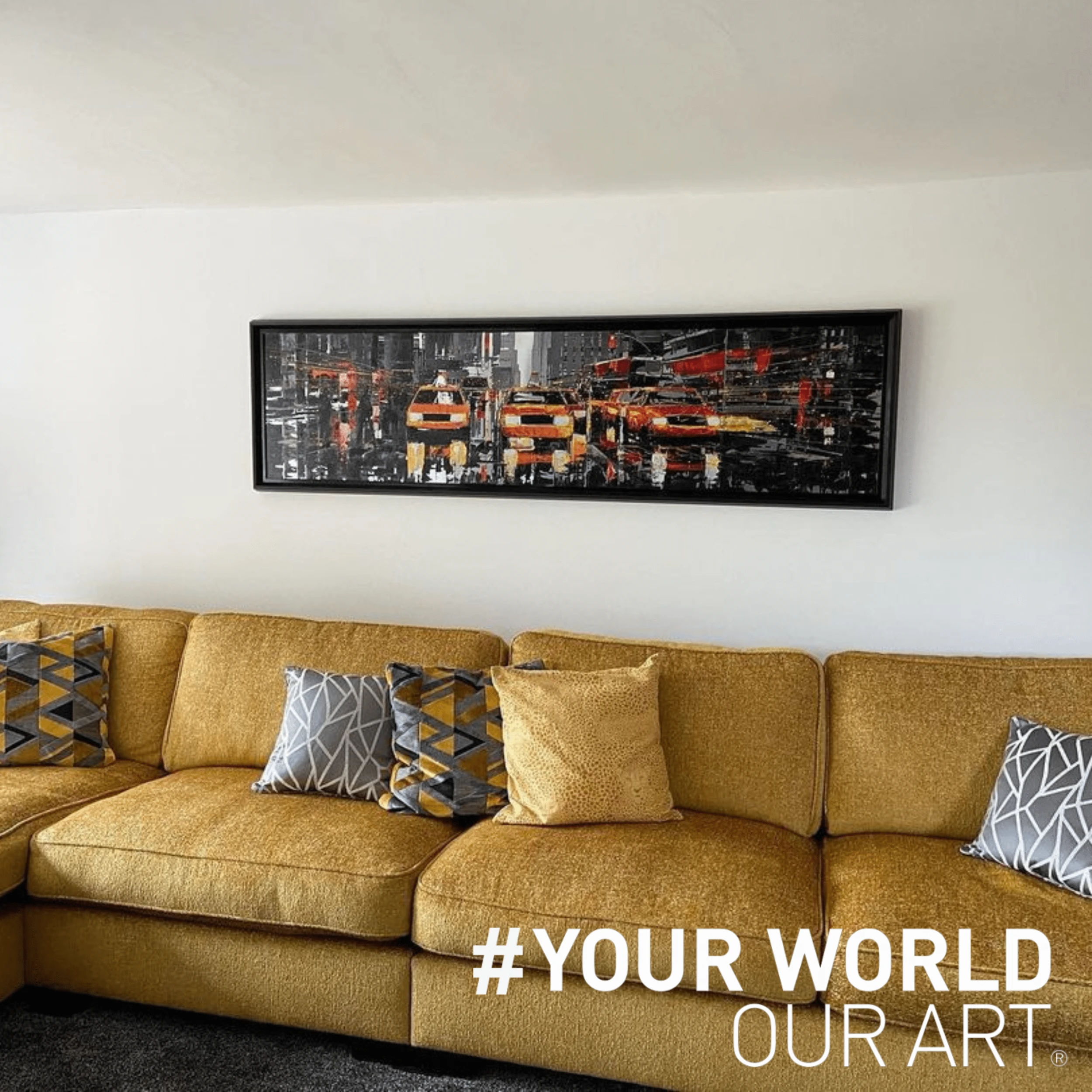 The hurried and fleeting moment of crossing a busy crosswalk in New York has been captured on aluminium here by landscape artist Paul Kenton. The panoramic composition features flicks of paint that depict the chaotic movements within the scene while exposed areas of aluminium work to accentuate the reflections of city lights in the rain by mirroring the changing light in your home throughout the day.