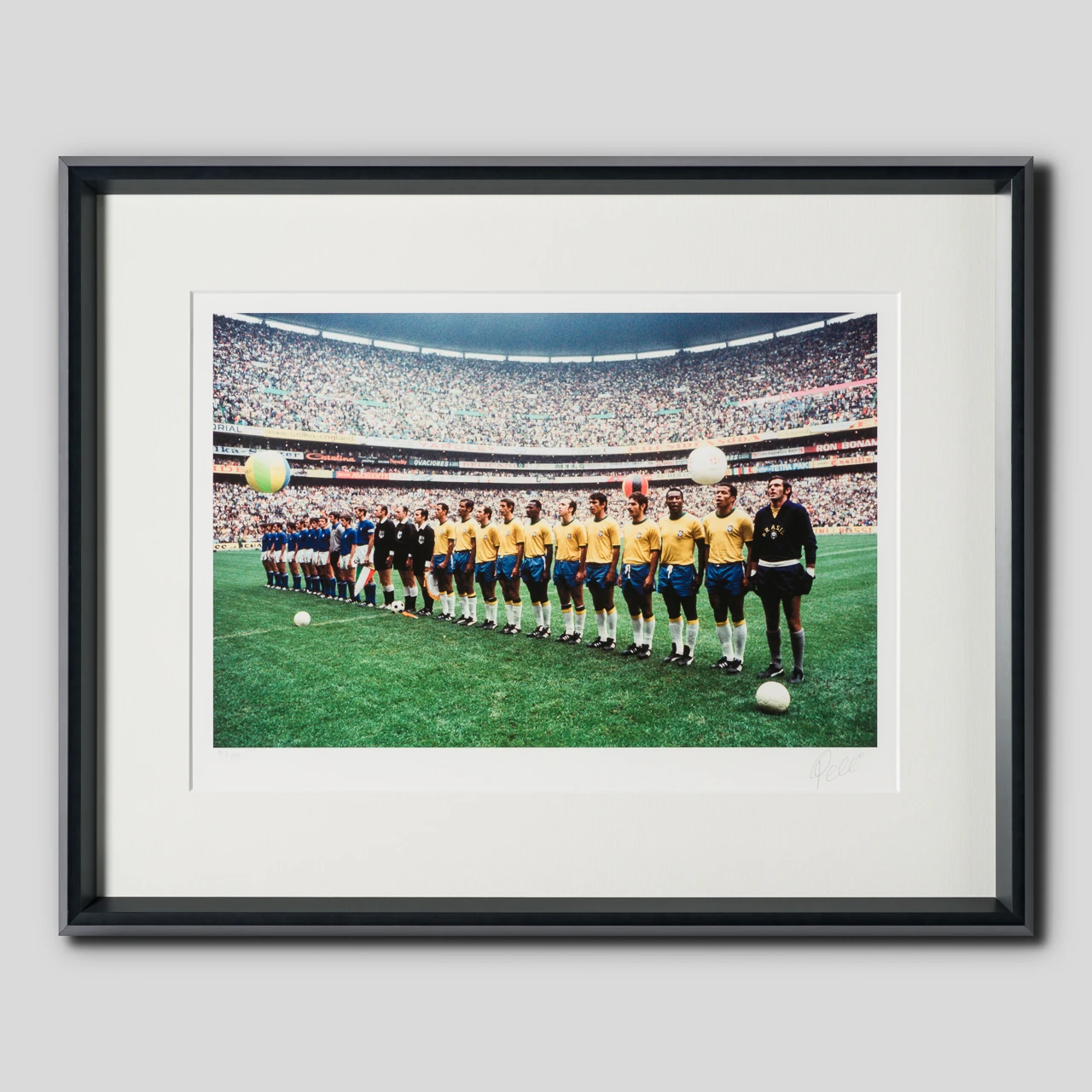 “Team Line-Up – World Cup Final, 1970” is a Pelé hand-signed limited edition Giclée on paper depicting world-famous footballer. Italy and Brazil in the pre-game line-up at the 1970 World Cup Final at the Azteca Stadium in Mexico City. Alongside Pelé were his teammates Félix, Carlos Alberto, Brito, Piazza, Everaldo, Clodoaldo, Gérson, Jairzinho, Tostão and Rivelino – known forever as the ‘beautiful team’ – the best ever to play the game.