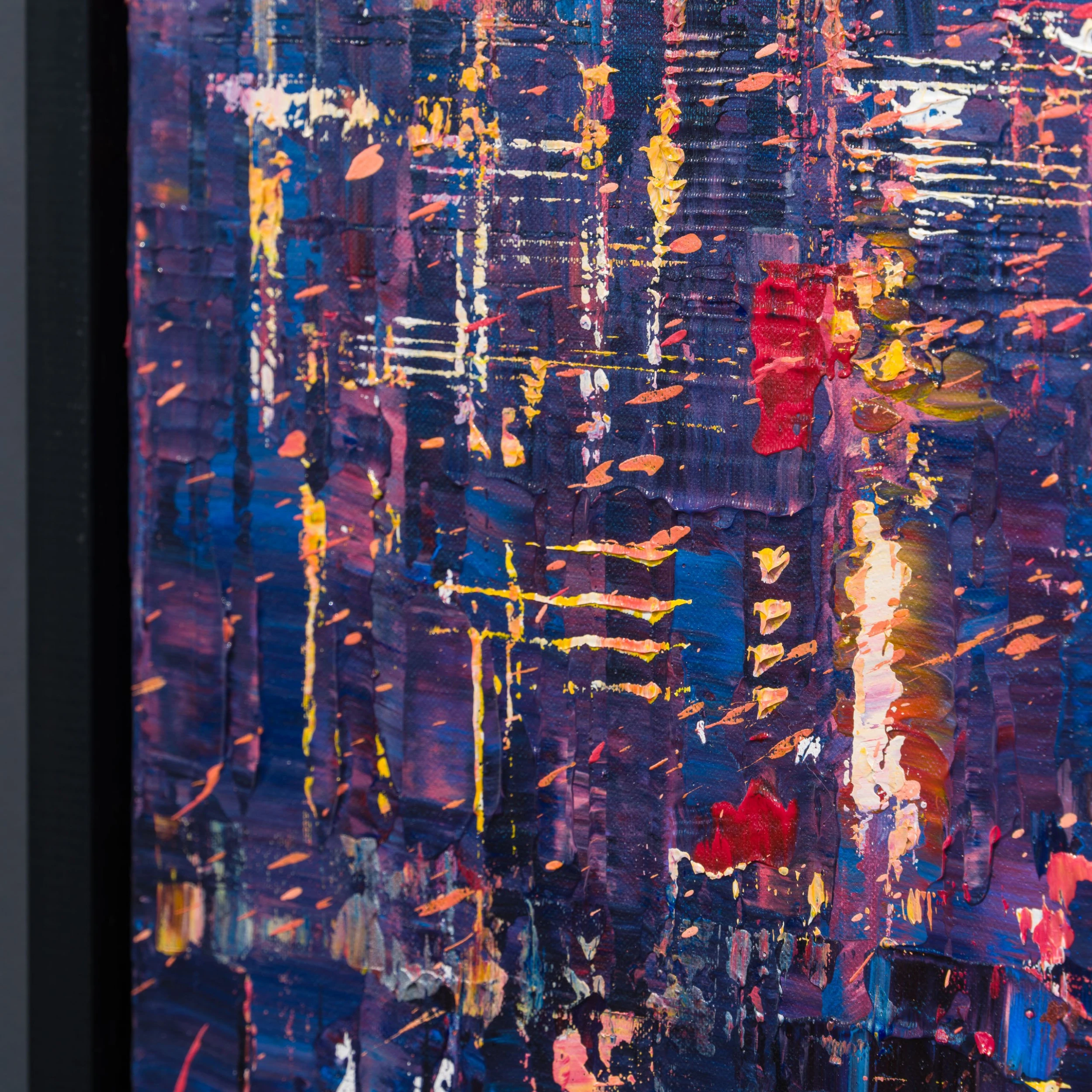 Painted with a spontaneous and impressionistic approach, the warm London skyline scene is simultaneously full of colour and darkness. Using sharp, small, and colourful accents, the artist has brought London to life, captures the majestic city of London, illuminated by glowing lights in a myriad of colours. An energetic kaleidoscope of colour, light and movement, this piece’s ability to make a statement is unmatched, allowing collectors to have a hypnotising escape in their house.