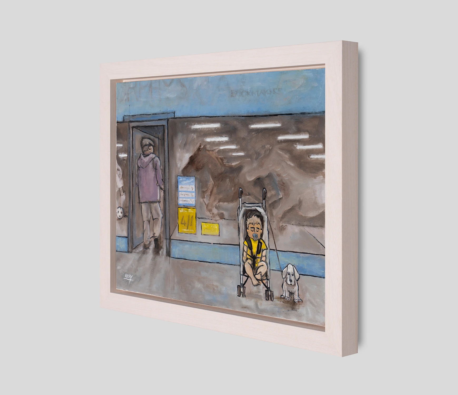 From the heart-warming to the hilarious, Stephen Roby uses his bright artistic style to interpret a range of scenes from his memory and imagination. This particular piece was ” based on an event that happened during my childhood. My father was a gambler and spent most his earnings in betting shops. He took me for a walk to the local betting shop when I was about 10 months old. He had won a significant amount for a change and rushed back home to tell my mother. Unfortunately, he had left me in the pram outside the bookies.”Â
