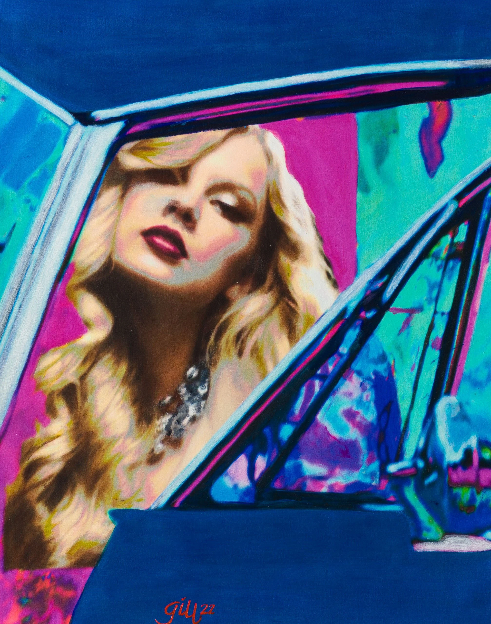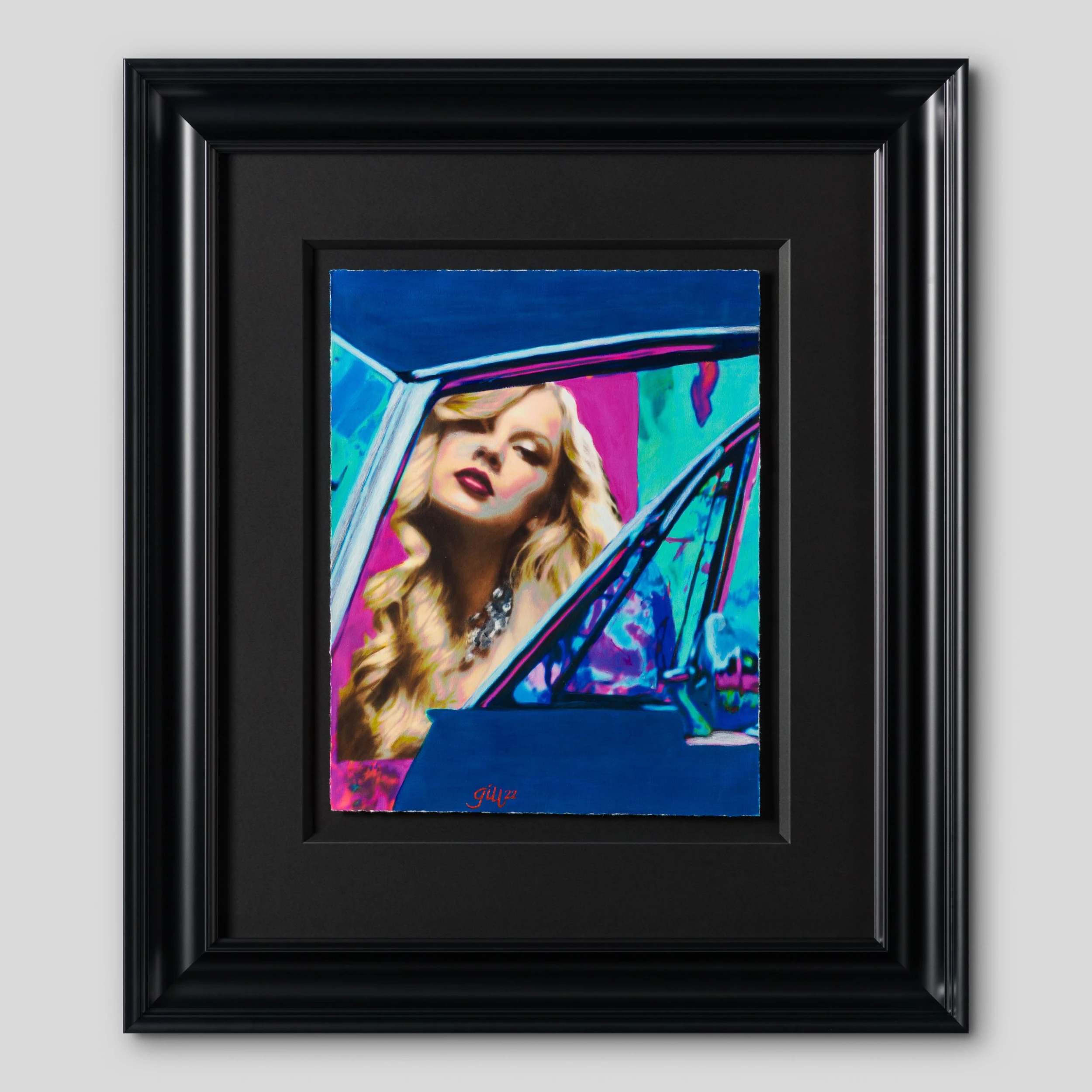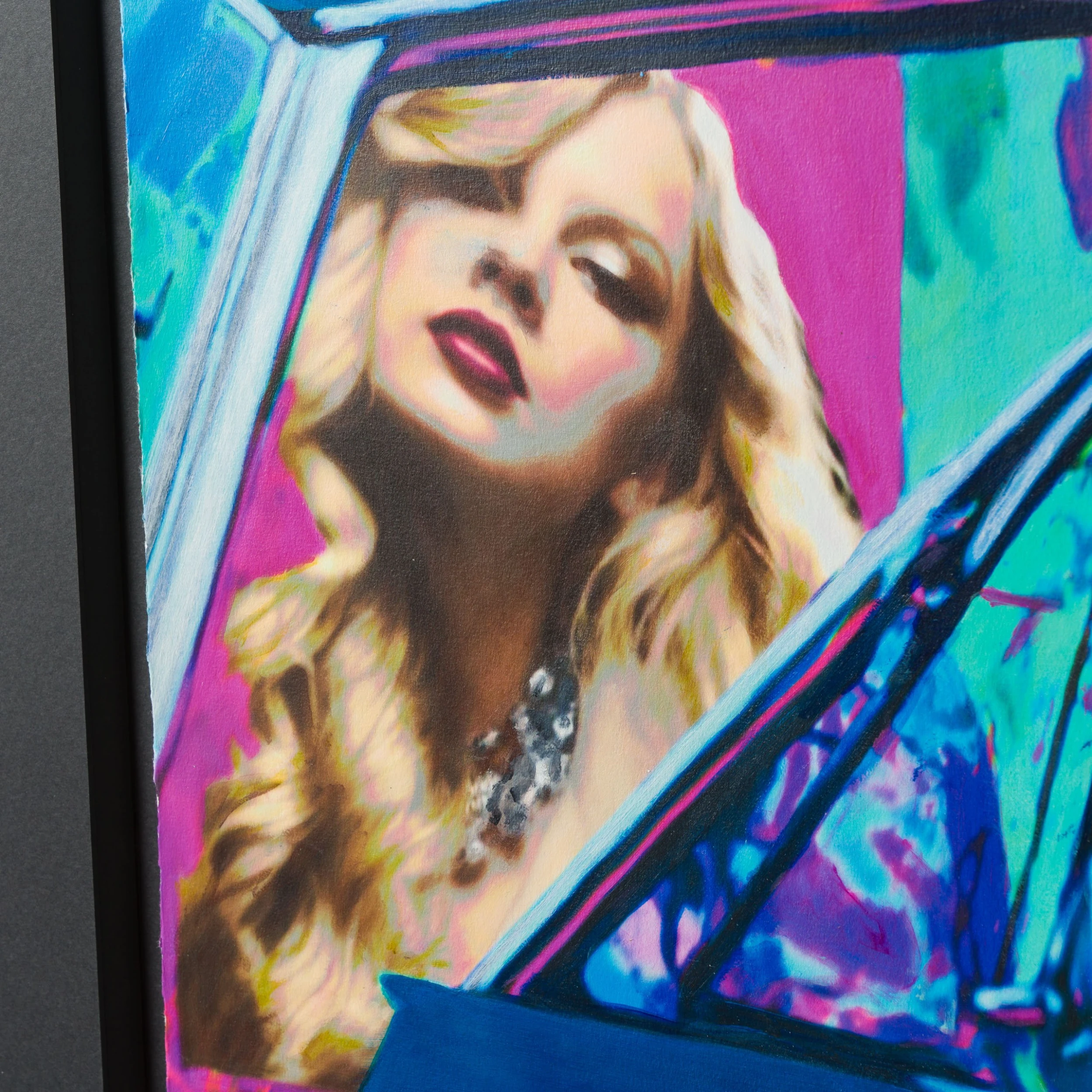 In this piece, Gill created an up-close piece that focuses predominantly on the model’s face and the car in his style of overlaying ‘montage’ imagery. The surrounding strong blue is characteristic of Gill’s pop art, highlighted by the shadows and interesting elements. The background colours are cool toned and create interesting shapes creating movement in the art. This iconic original is a statement piece!