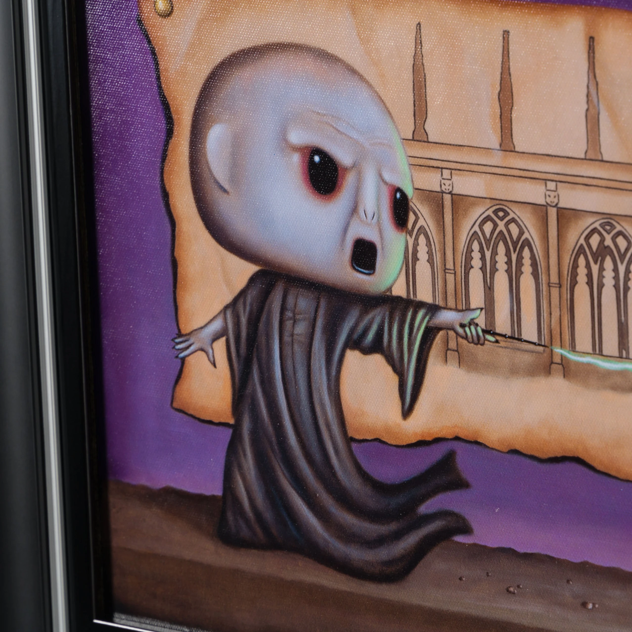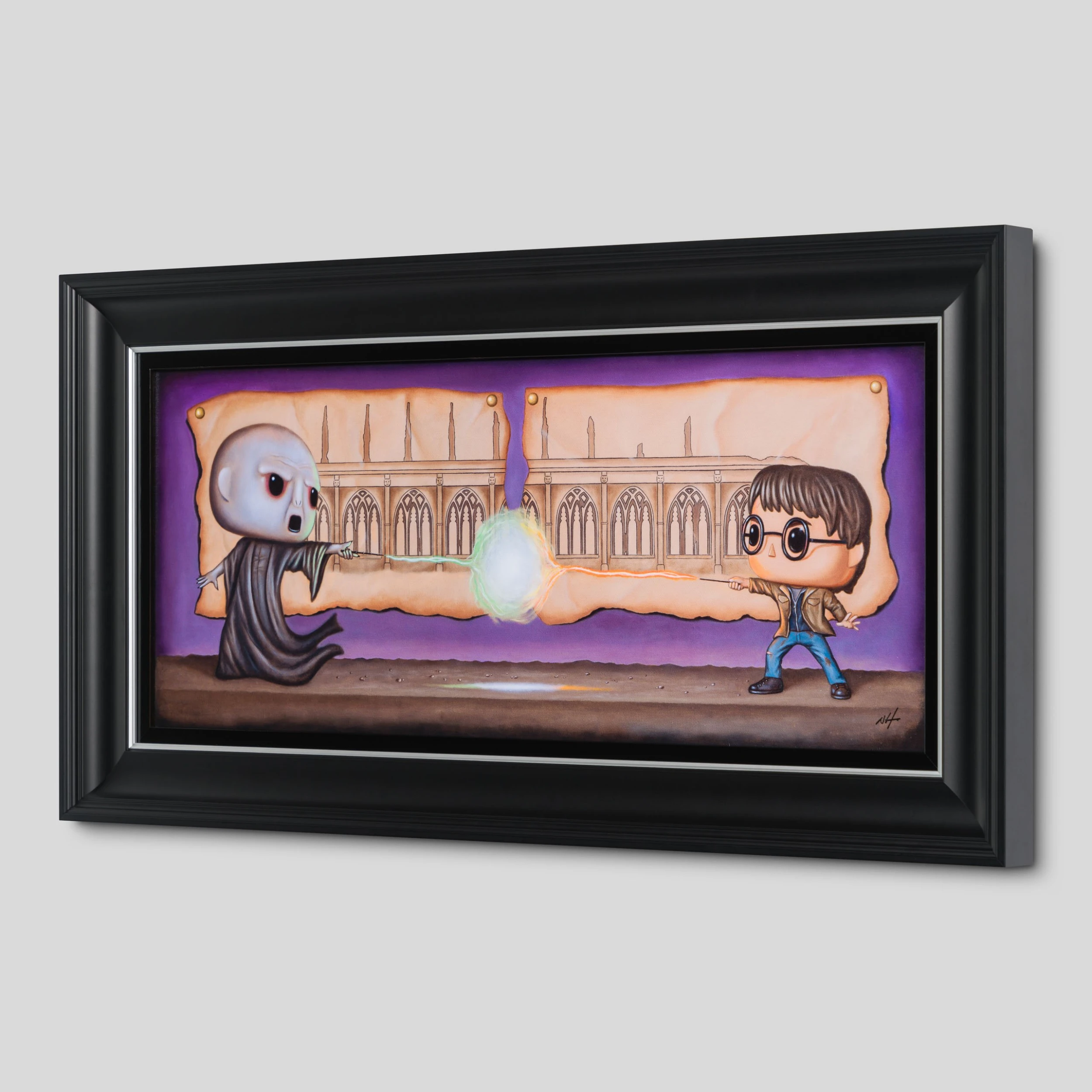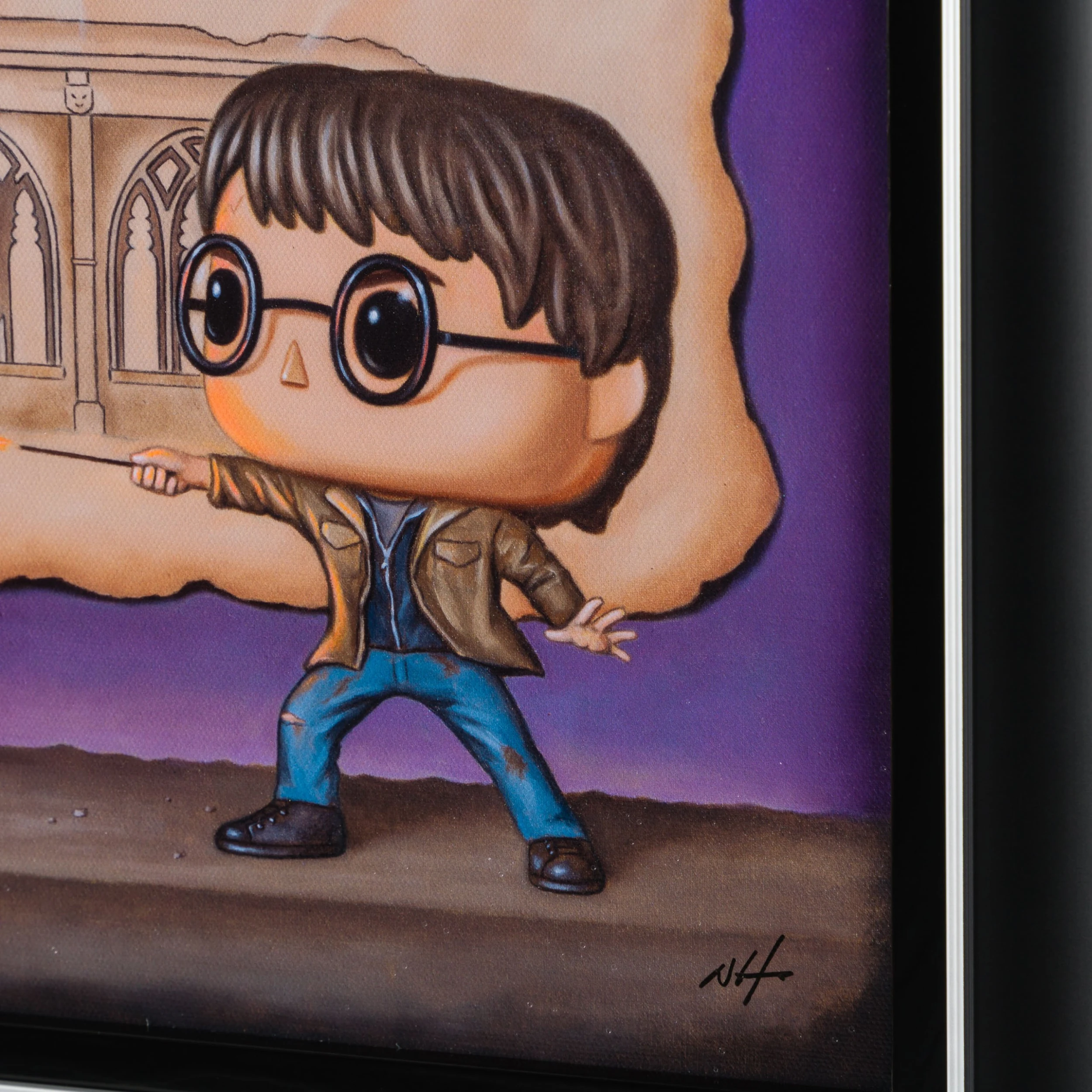 In this signed limited edition by , we see one of the world’s most iconic and notorious characters rendered in an extra-ordinarily magical way. In his signature style with ripped paper backgrounds and still life toys, Humphries created another universe that appeals to our inner child and magically captures the imagination and nostalgia of childhood, bringing these feelings to life on canvas. The artist told us he wanted the collection to represent the main character’s journey from his early day at the school to his final battle with the main villain.