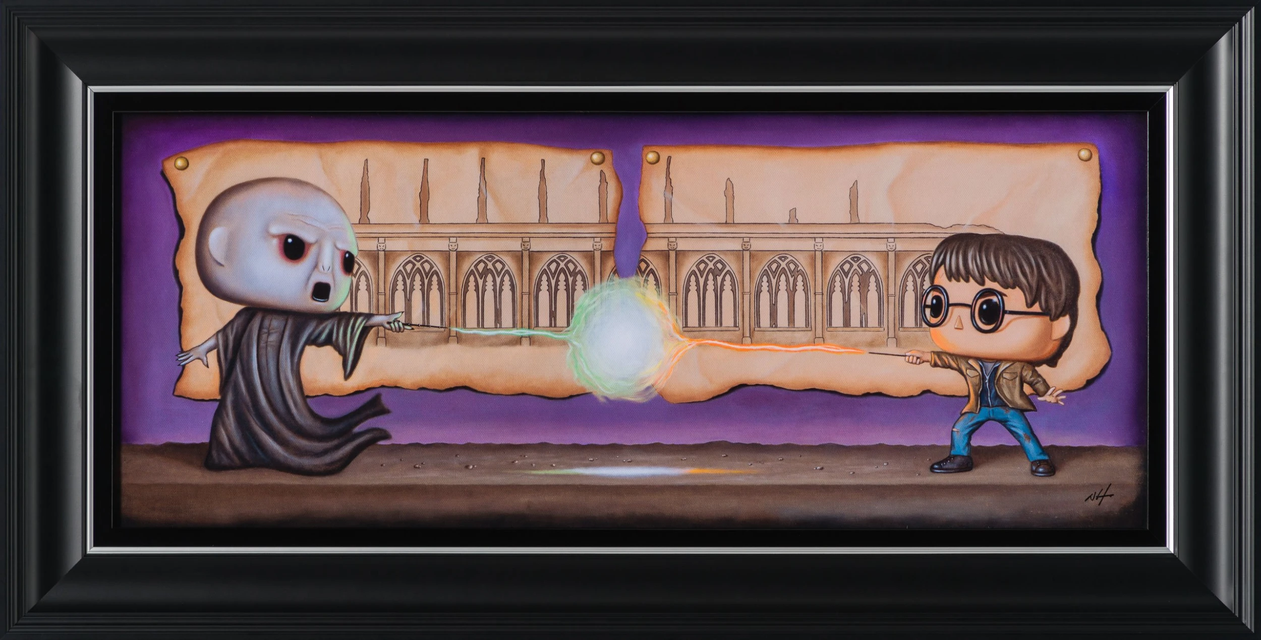 Sketched in charcoal first to achieve the fluidity and movement of the clothes, the “Final Battle” represents the climatic end of the saga with the magical fight between the beloved main character and villain. As old as time, this is the classic battle of good vs evil, in Nigel’s day it was cops and robbers, but for many growing up with these characters it’s the light and darkness of this magical universe. That theme is instantly recognisable and a part of almost every playful narrative you can imagine. With a crumbling building in the parchment paper on a purple background, the strong vibrant colours from the lightning bolts add a subtle touch of drama! Featuring the main character and the main villain, this endearing piece is the perfect gift for superfans of the saga!