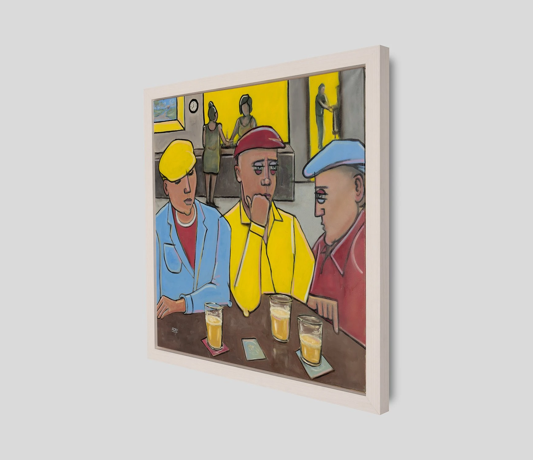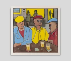 From the heart-warming to the hilarious, Stephen Roby uses his bright artistic style to interpret a range of scenes from his memory and imagination. On this particular piece the artist notes, “this painting is based on a group of men in a pub putting the world to rights over a couple of pints. The guy on the right is trying to hammer his point across by pointing to the table, much to the boredom of his drinking partners.”Â