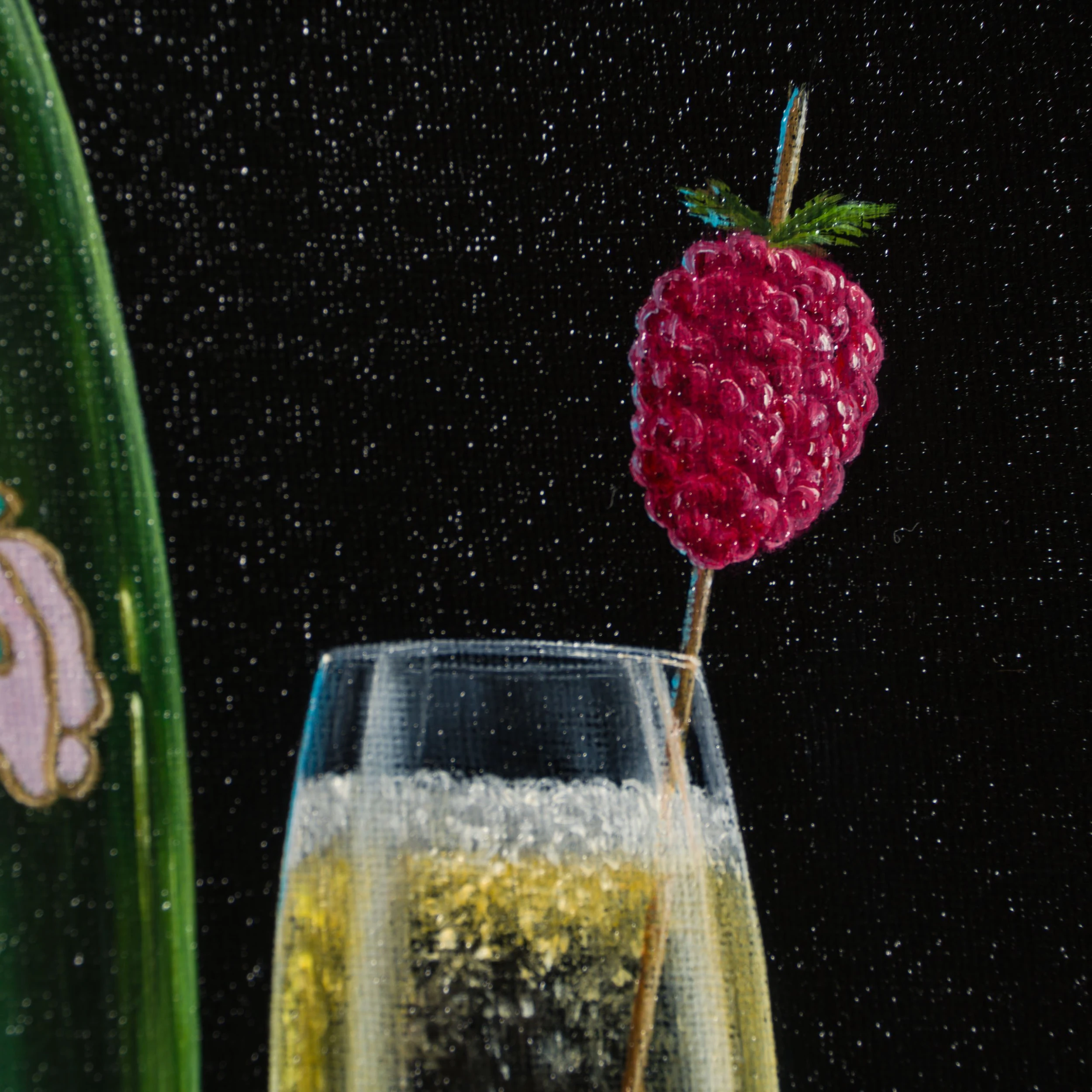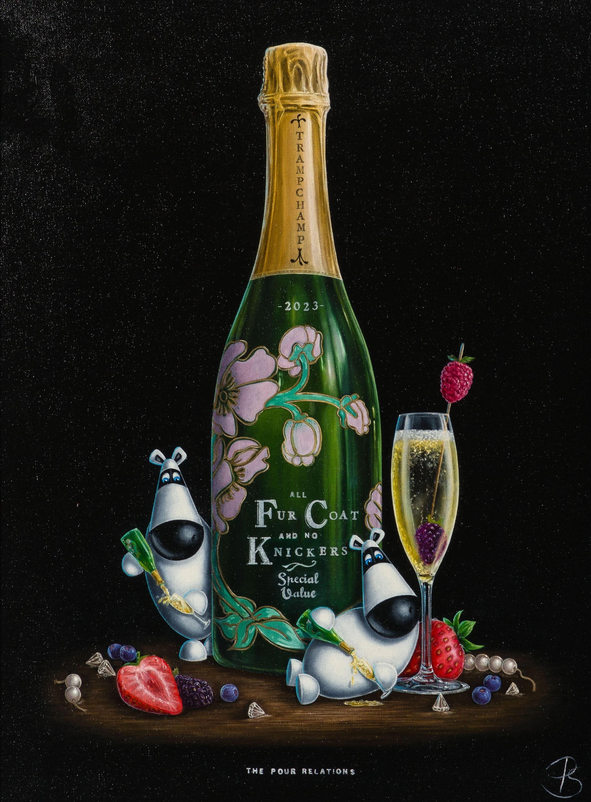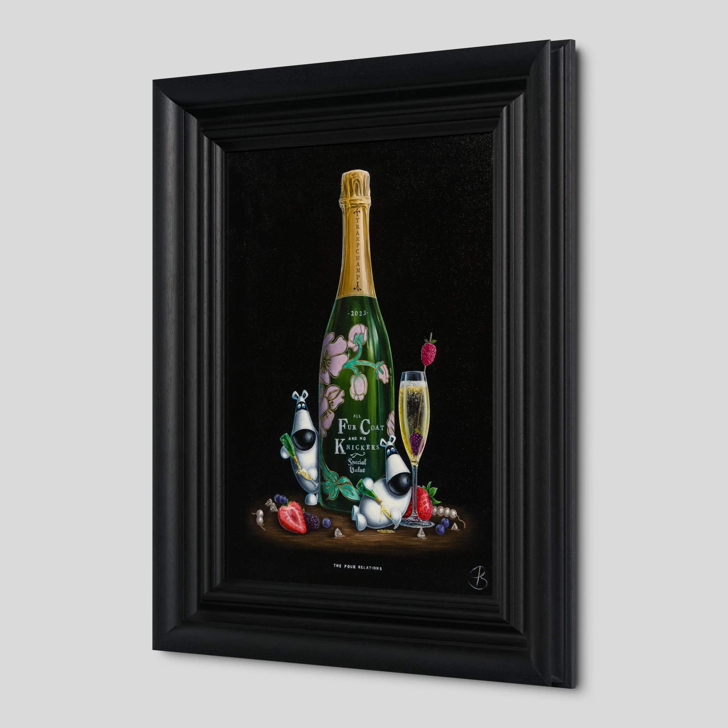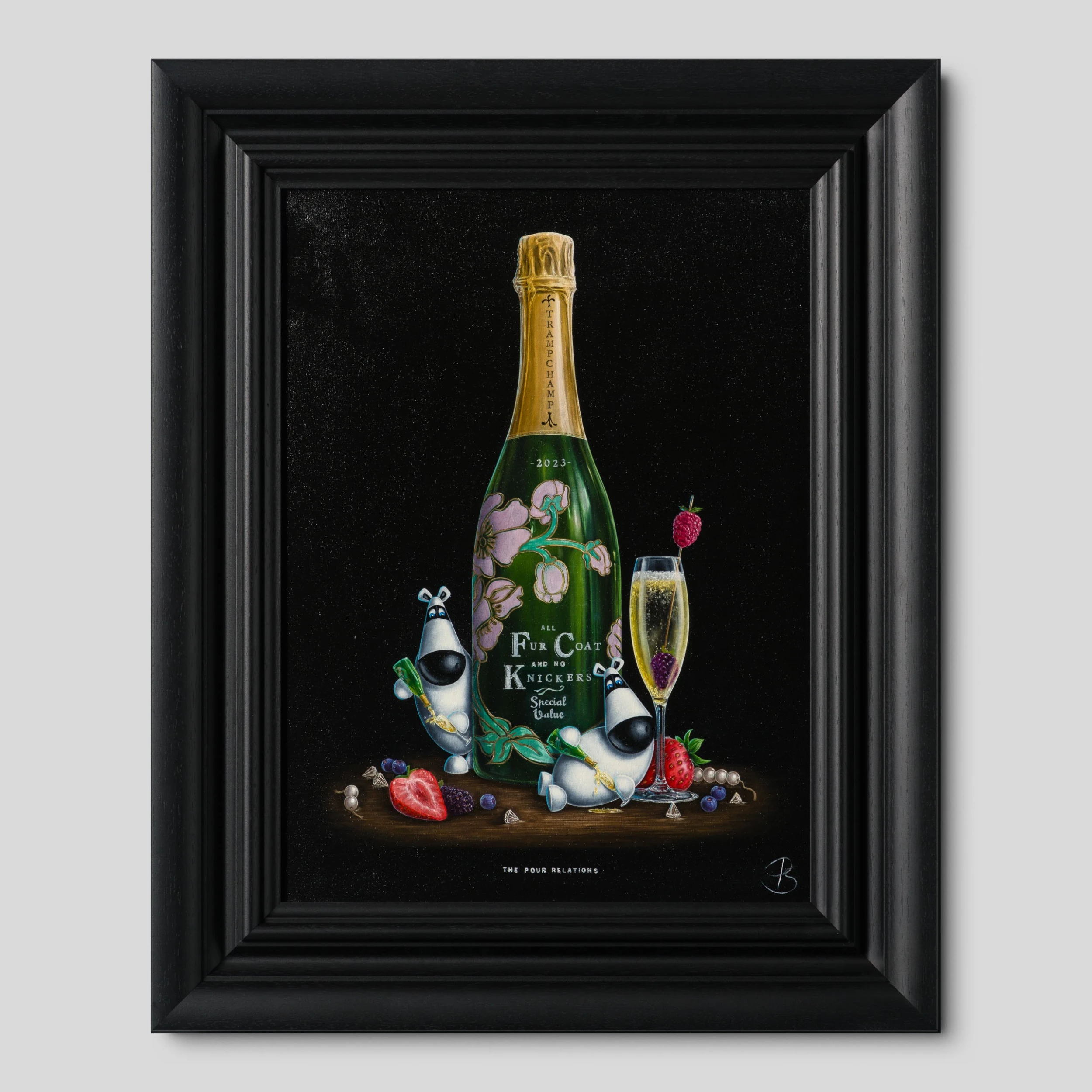In a traditional still-life composition creating a visually appealing and balanced image, “The Pour Relations” is vignetted by a classic and simple black background. The bold colour is incredibly punchy, completely focussing the attention on the tantalising tipple and scene at hand. Ever a fine artist, the piece has been painted in vivid oil paint with the incredible craftsmanship we have come to expect from skilled still-life painter,
