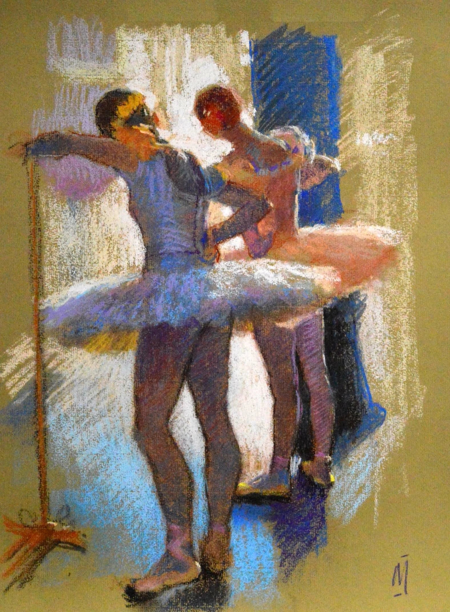 Working primarily in oil paints, this original artwork sees Nigel Mason enter the realm of pastels which was popularised by Edgar Degas in the 19th century. Much like Degas, Nigel has also focused on how light and space interact with the ballerina forms rather than how they interact with the space.