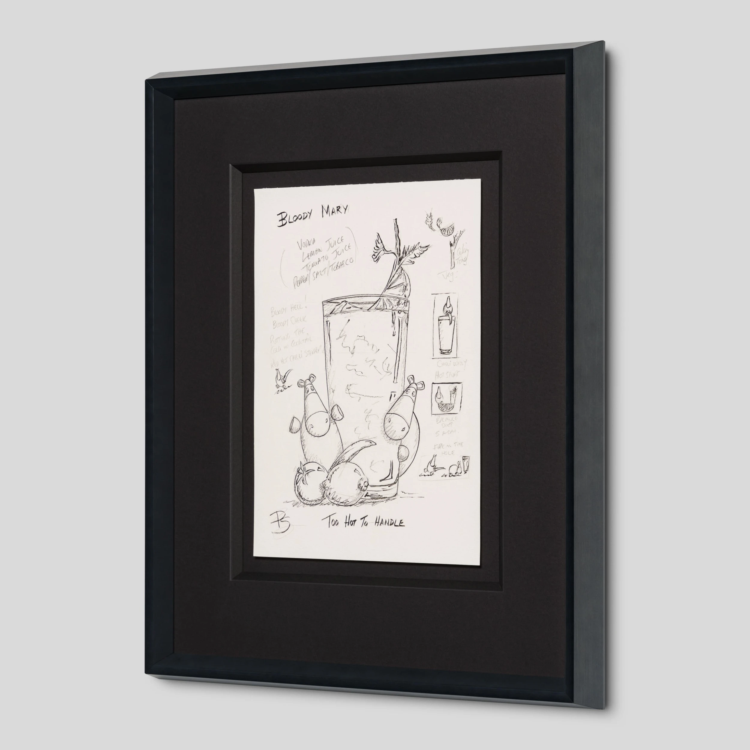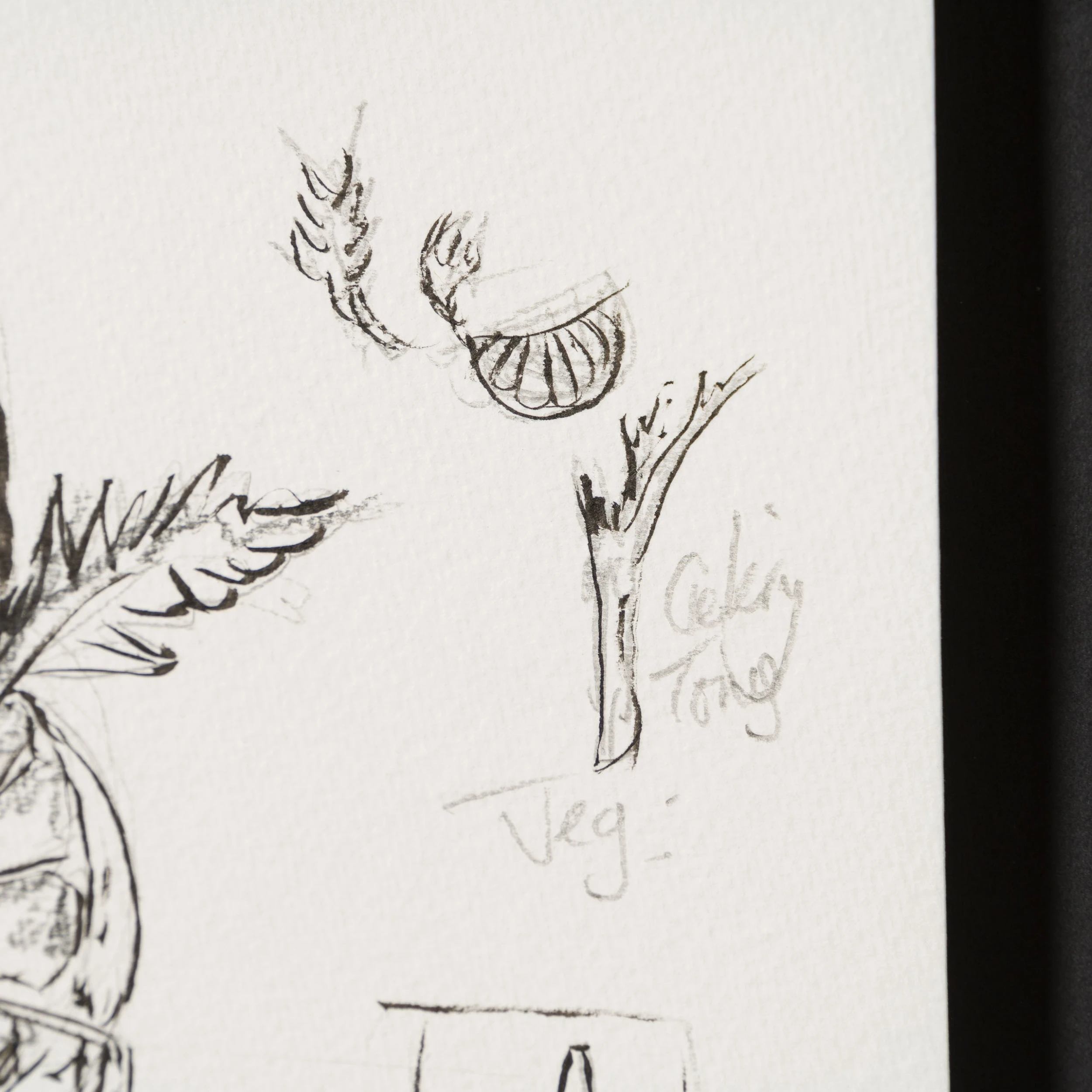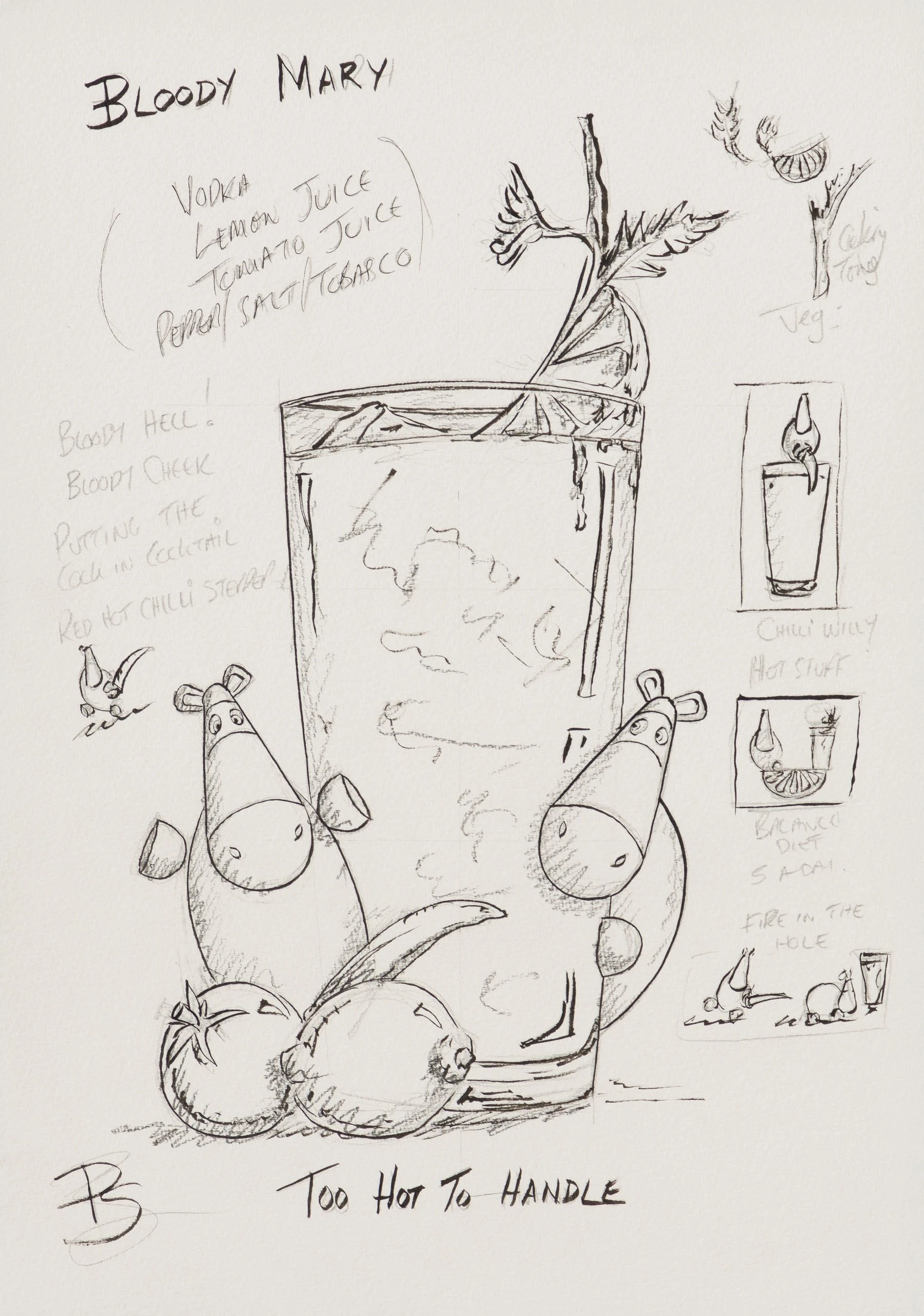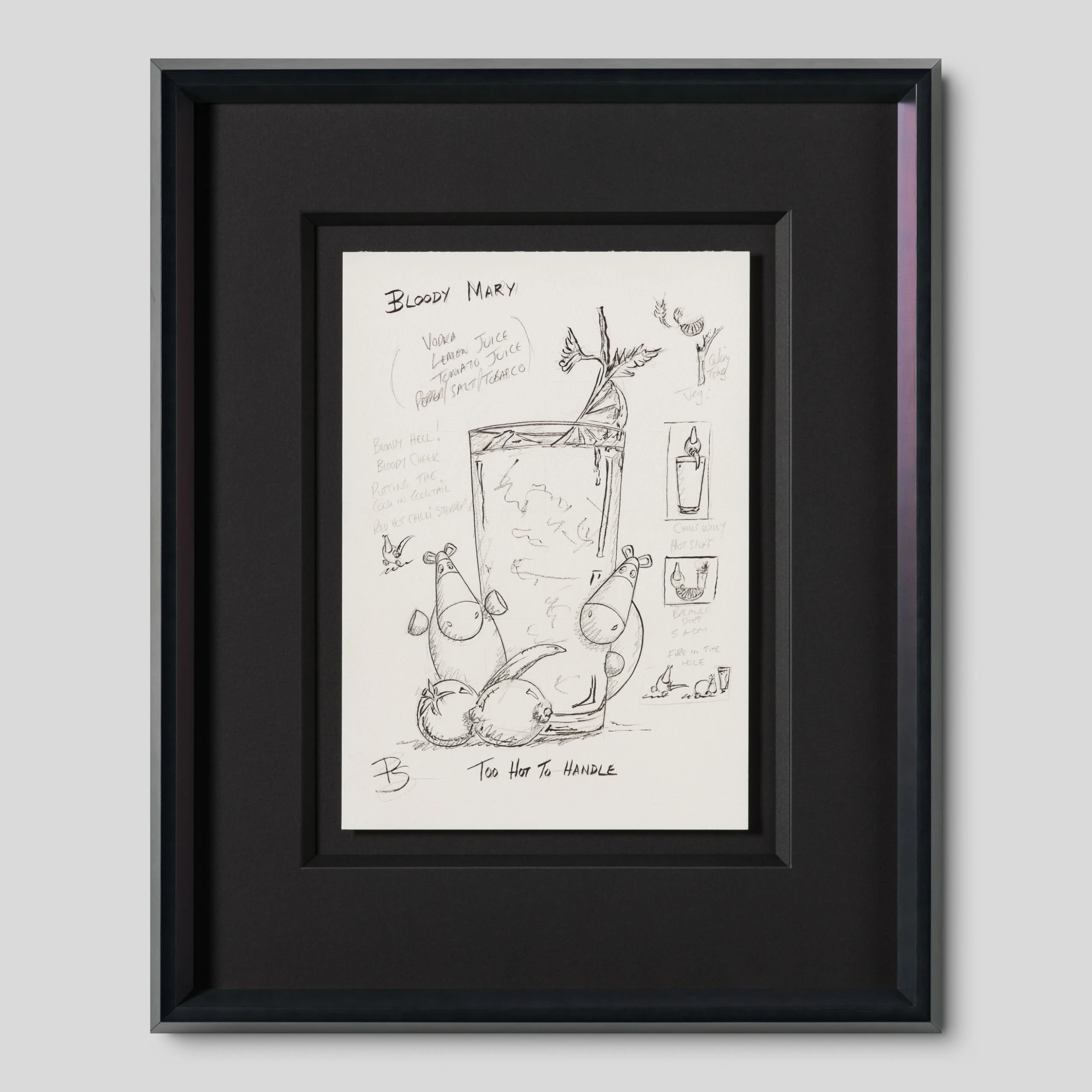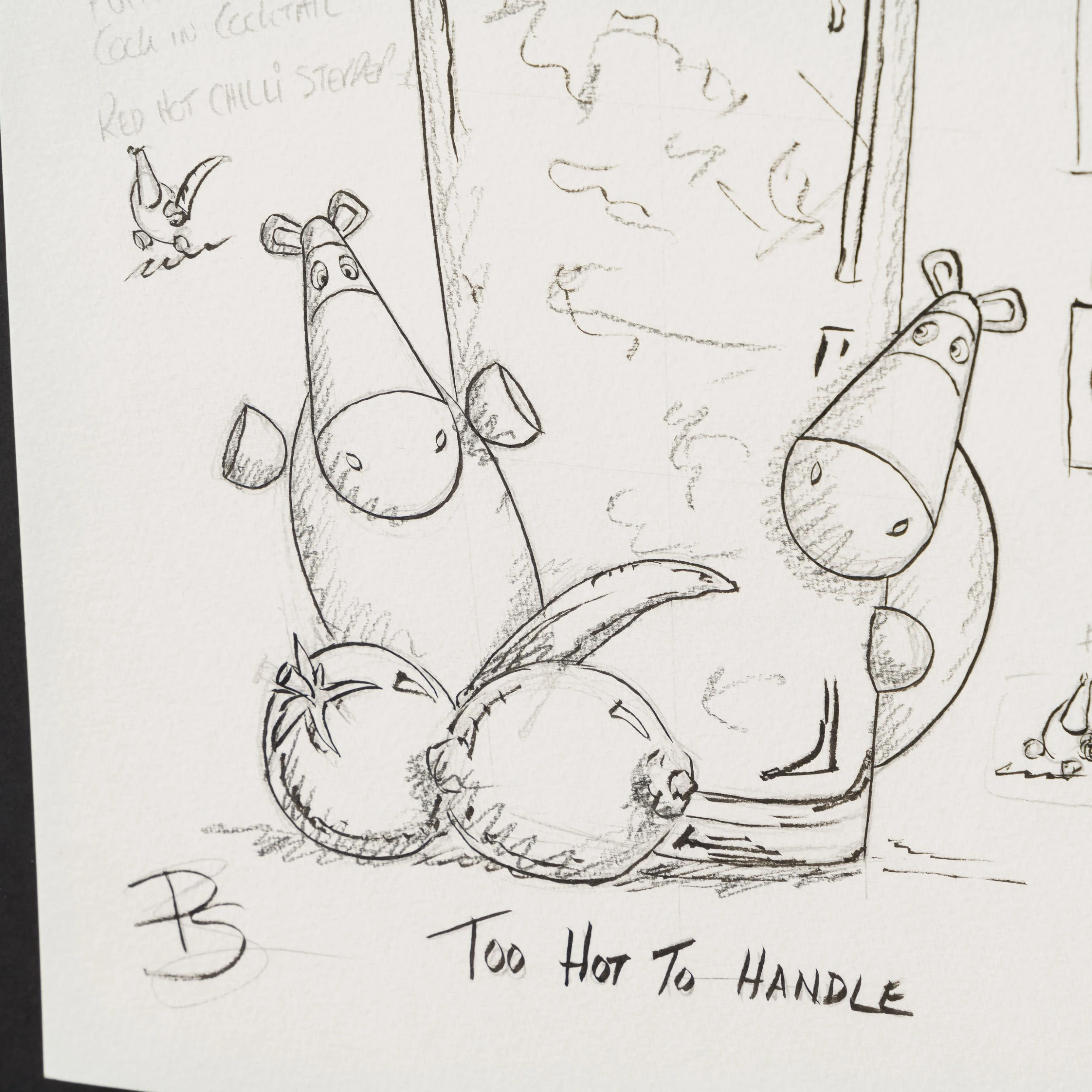The artistic duo is back by popular demand with the latest in their Impossimal drinks series: ‘The Shaker Maker’, featuring their own twist on a menu of the classic cocktails we all know and love. The Shaker Maker sees the Impossimals bring out in glorious bold colour the fun we know and love, coupled with a bit of Dutch Courage and remind us to find the humour in life, ourselves, and the times we share with friends and family! In a traditional still-life composition creating a visually appealing and balanced image, “Too Hot To Handle” is a drawing the artist created before mastering the oil painting.