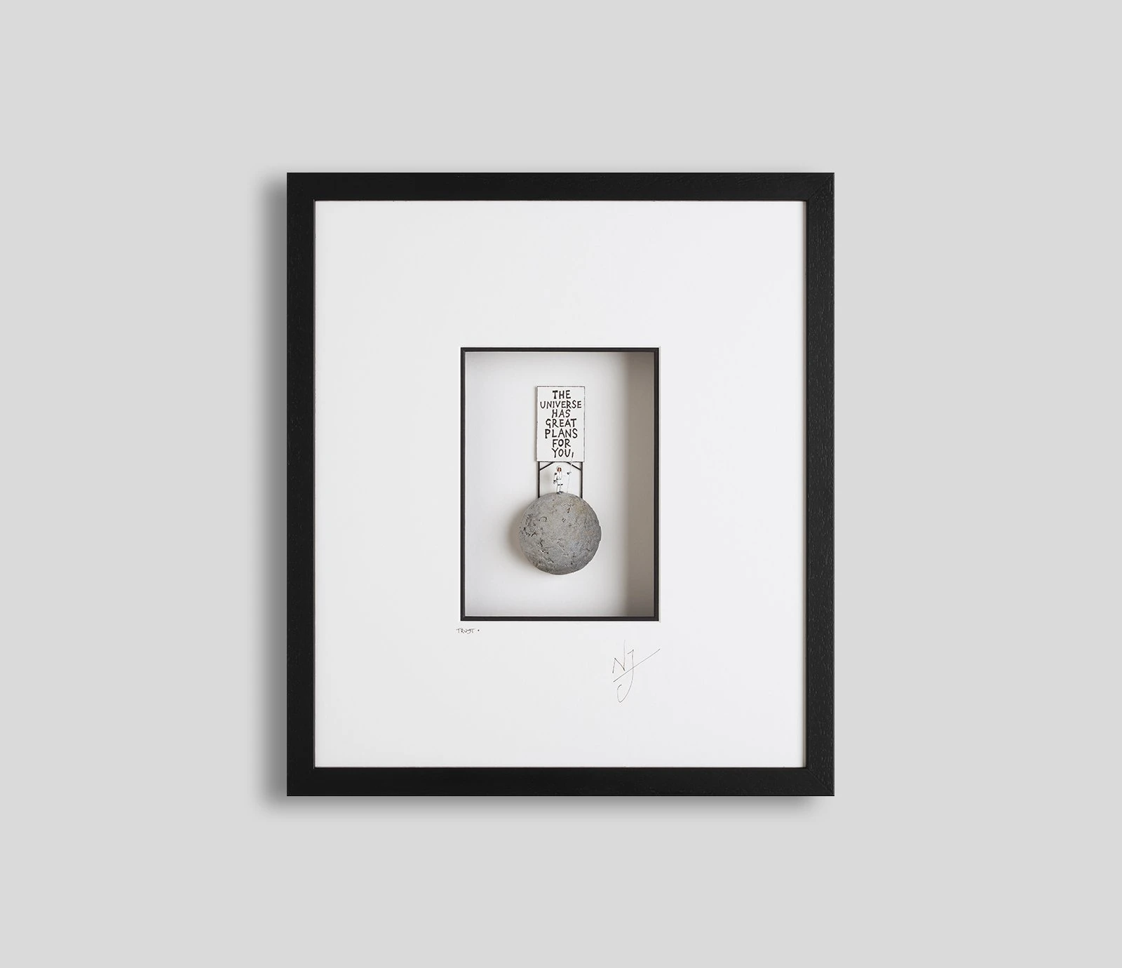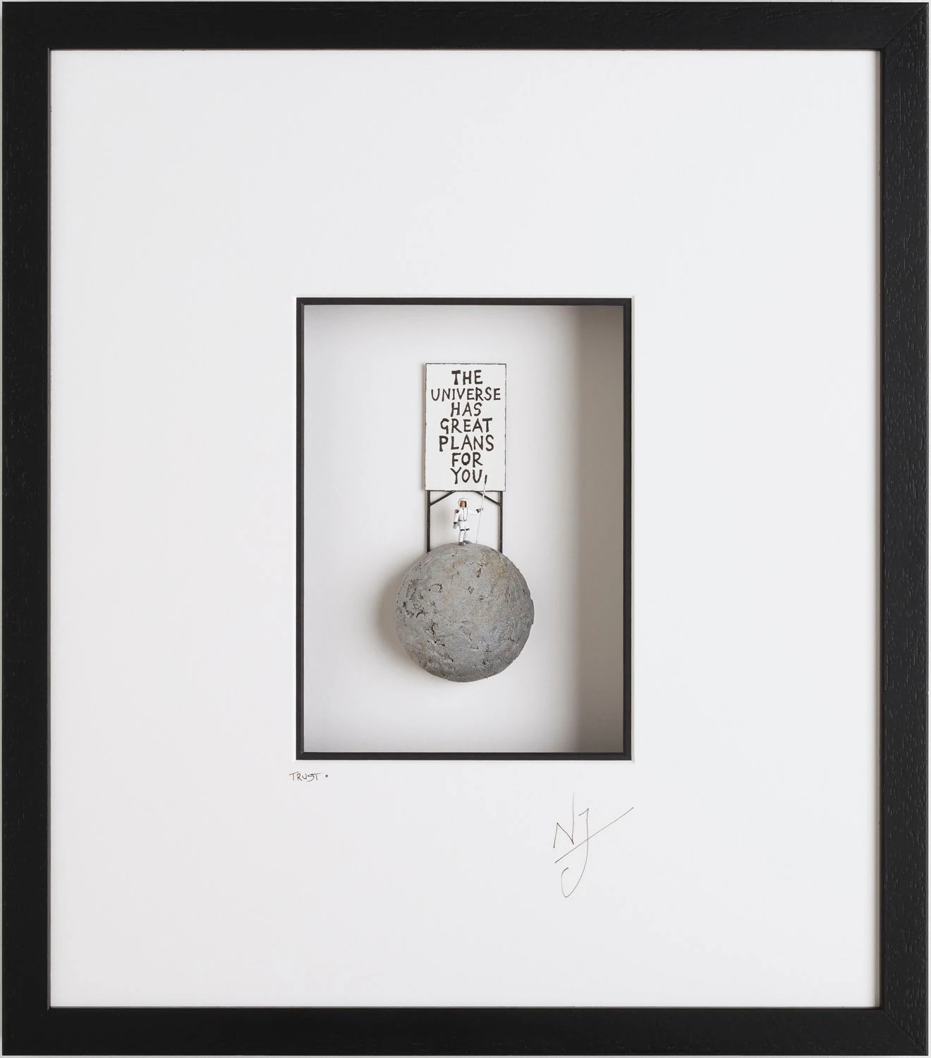 Carved from polystyrene and coated in marble dust, the moon in each of these wall sculptures by Nic Joly is perfectly detailed and unique. Accenting the spaceman who holds a handmade sign that reads ‘The Universe has great plans for you’, the scene sends a strong message of personal resilience through hard times and encourages trust that better days are coming. Along with its gorgeous minimalist composition, the theme of space represents the concept behind the artwork with an emphasis on maintaining trust and faith in yourself when alone and lost in an unrecognisable place. The stunning hand embellishments ensure that this artwork makes a powerful yet refined artistic statement in any interior.