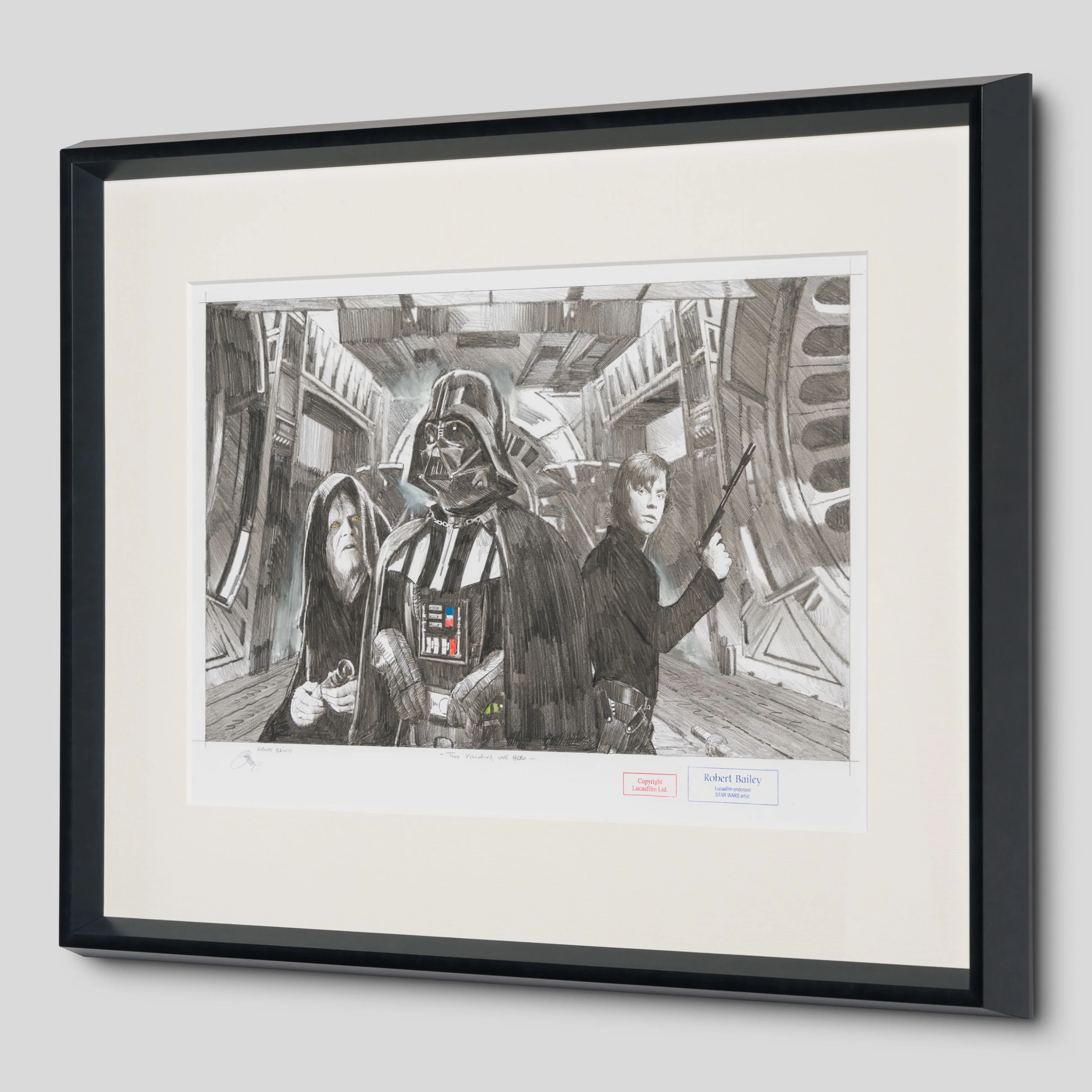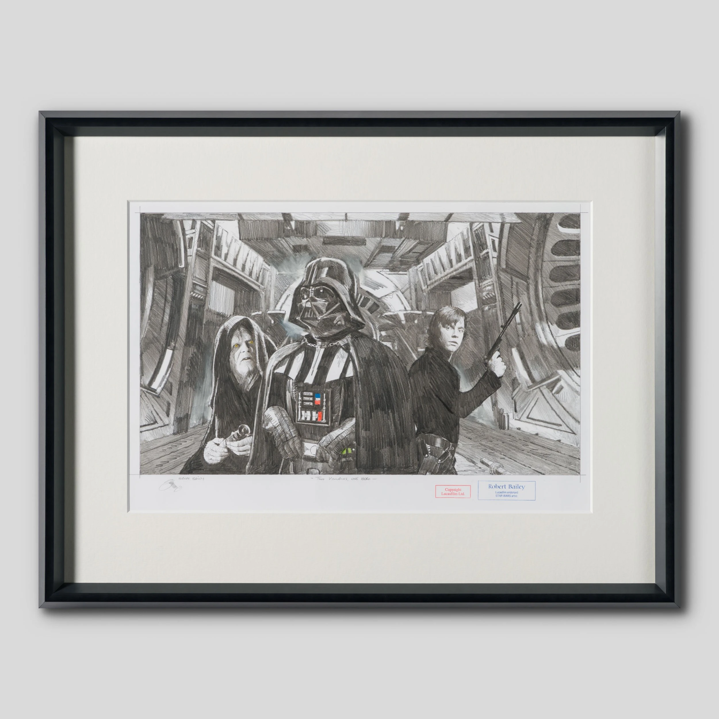 Each drawing created by Robert captures the essence of the iconic scene and allows collectors to own a real piece of Star Wars history. As part of his amazing portfolio, created this special drawing featuring Darth Vader, Darth Sidious and Luke Skywalker.