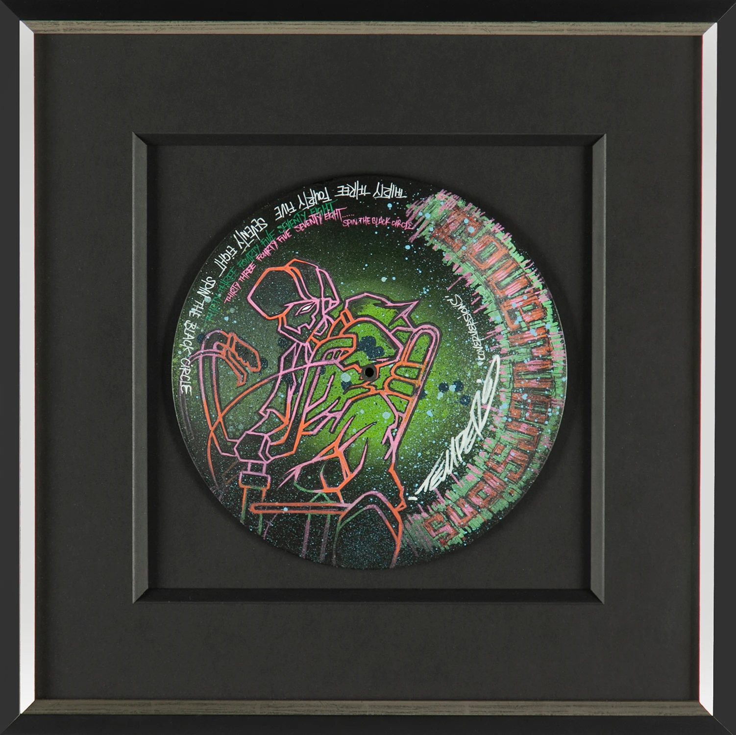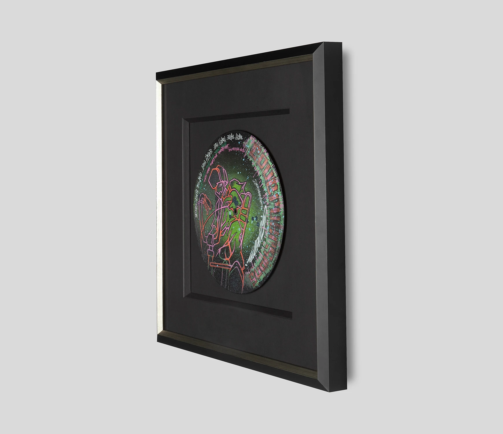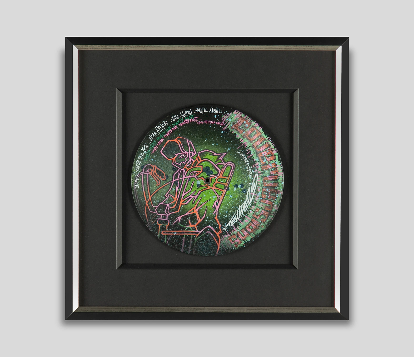 A painted 12″ vinyl record framed by Temper.
