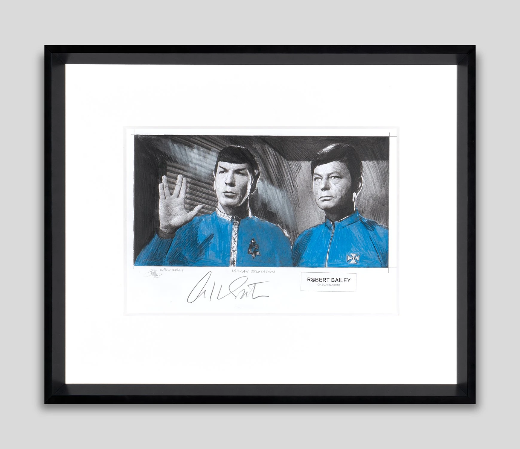 With bright pops of blue accentuating the different tones of delicate graphite, this otherworldly original drawing by Robert Bailey perfectly captures the iconic characters and retro quality of Star Trek: The Original Series.