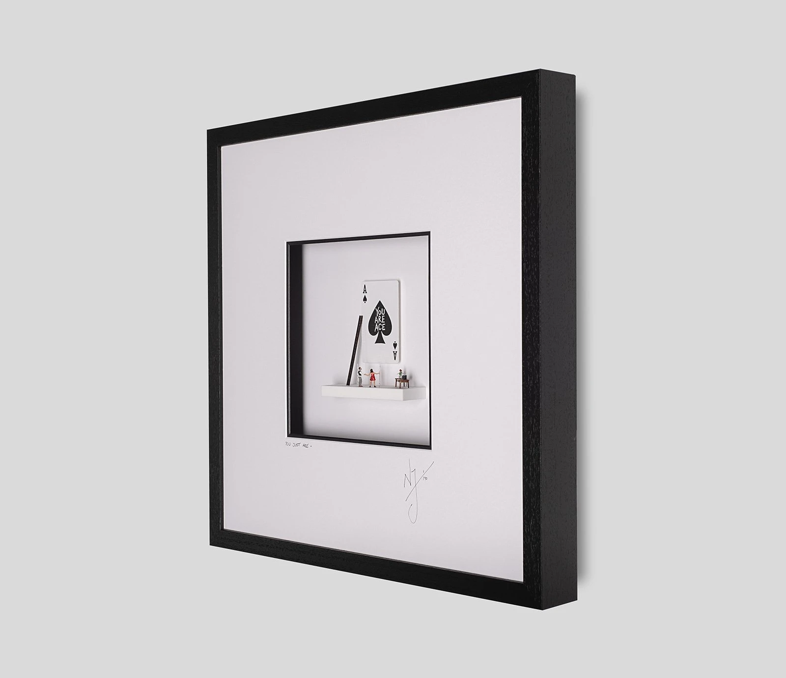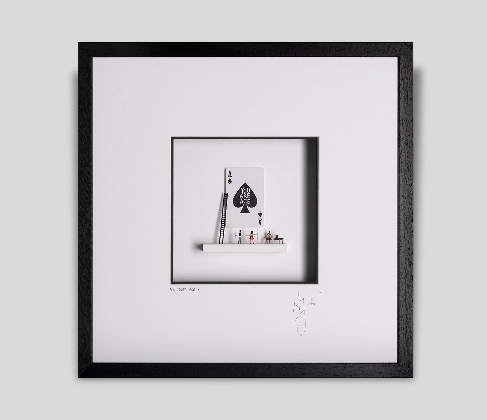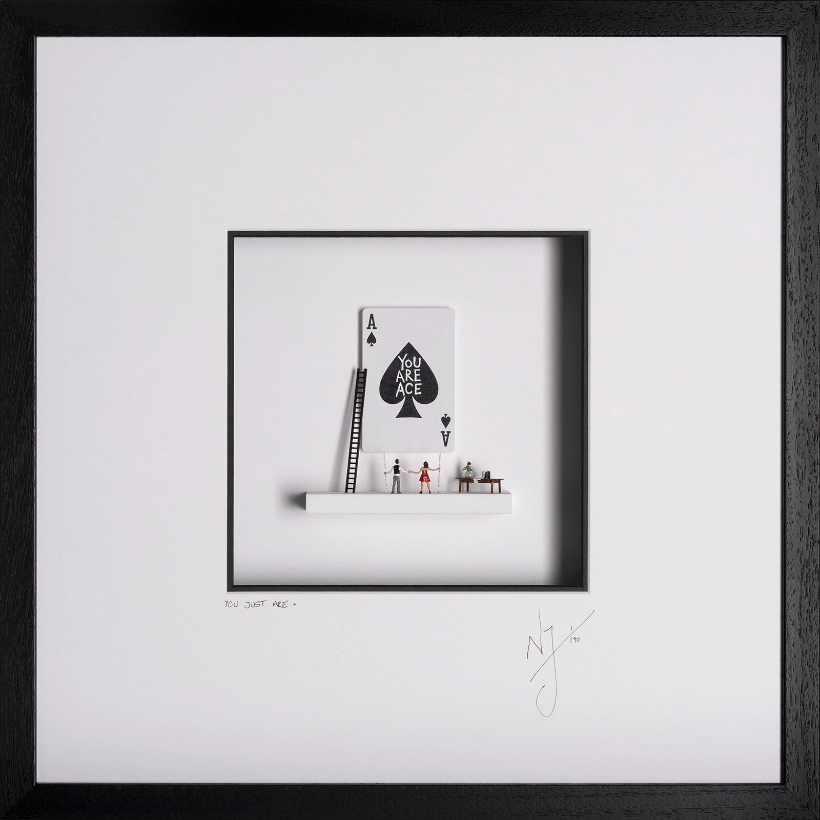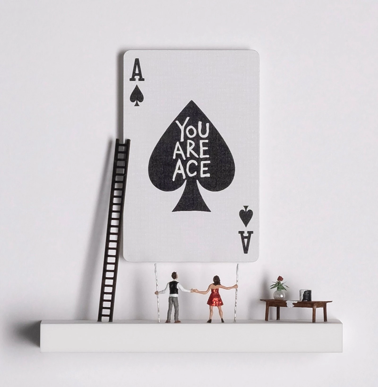 This intricate artwork by Nic Joly is an honest, real, and raw depiction of love. It features a re-designed playing card embellished with words, two bronze-cast miniature figures with painting tools, and a freshwater pearl holding a flower. Â